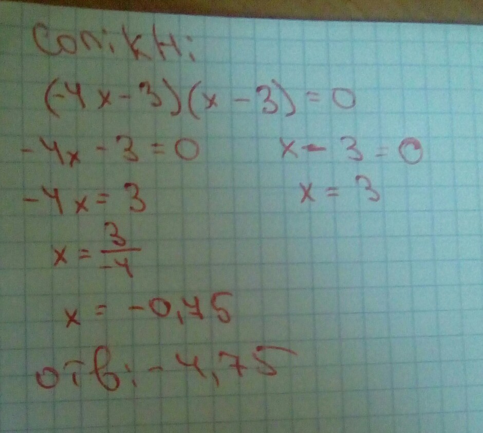 Решите уравнение.(-4x-3)(x-3)=0 Если уравнение имеет более одного корня, в ответ запишите меньший из корней