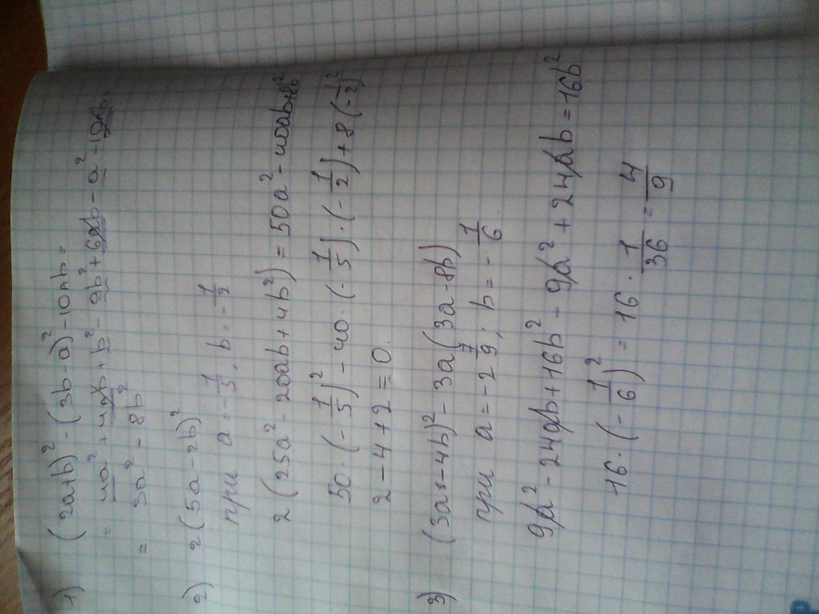 3)Найдите значение выражения (3a-4b)^2 - 3a(3a-8b) при a=-2.7/9 b=-1/6