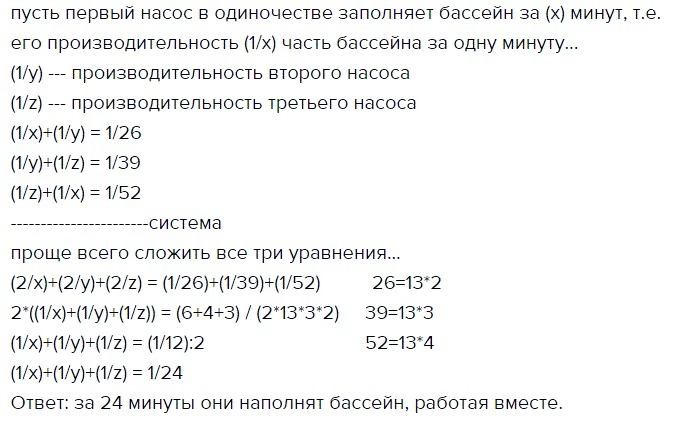 Первый и второй насосы наполняют бассейн за 26 минут, второй и третий — за 39 минут, а первый и третий — за 52 минуты. За сколько минут три эти насоса заполнят бассейн, работая вместе? помогите пожалуйста решить) очень надо)