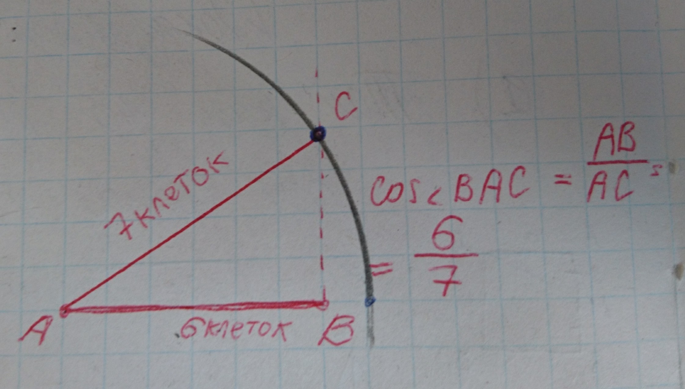 На циркуле устанавливаем радиус равный AC (7 клеток = 3,5 см). Иголку ставим на точку А и делаем дугу до пересечения со вторым катетом. Точка пересечения дуги и второго катета даёт нам точку С.