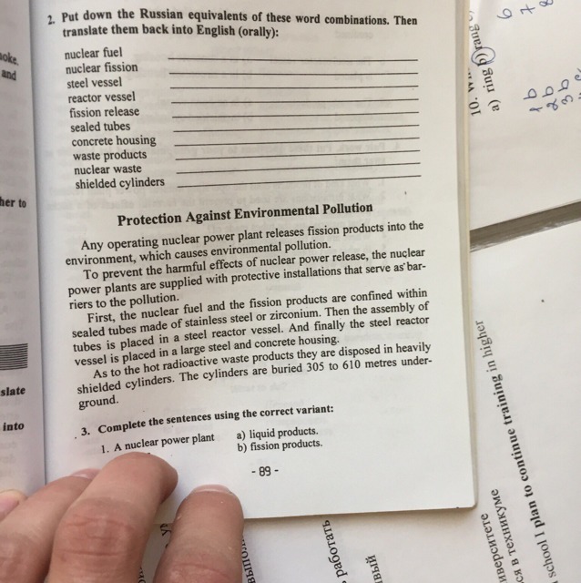 Nuclear fuel - ядерное топливо; nuclear fission - ядерное деление; steel vessel - стальной корпус; reactor vessel - корпус реактора; fission release - выход продуктов деления; sealed tubes- закрытые/запечатанные трубы; concrete housing - бетонный корпус (кожух); waste products- отходы; nuclear waste - ядерные отходы; shielded cylinders- защищенные цилиндры.