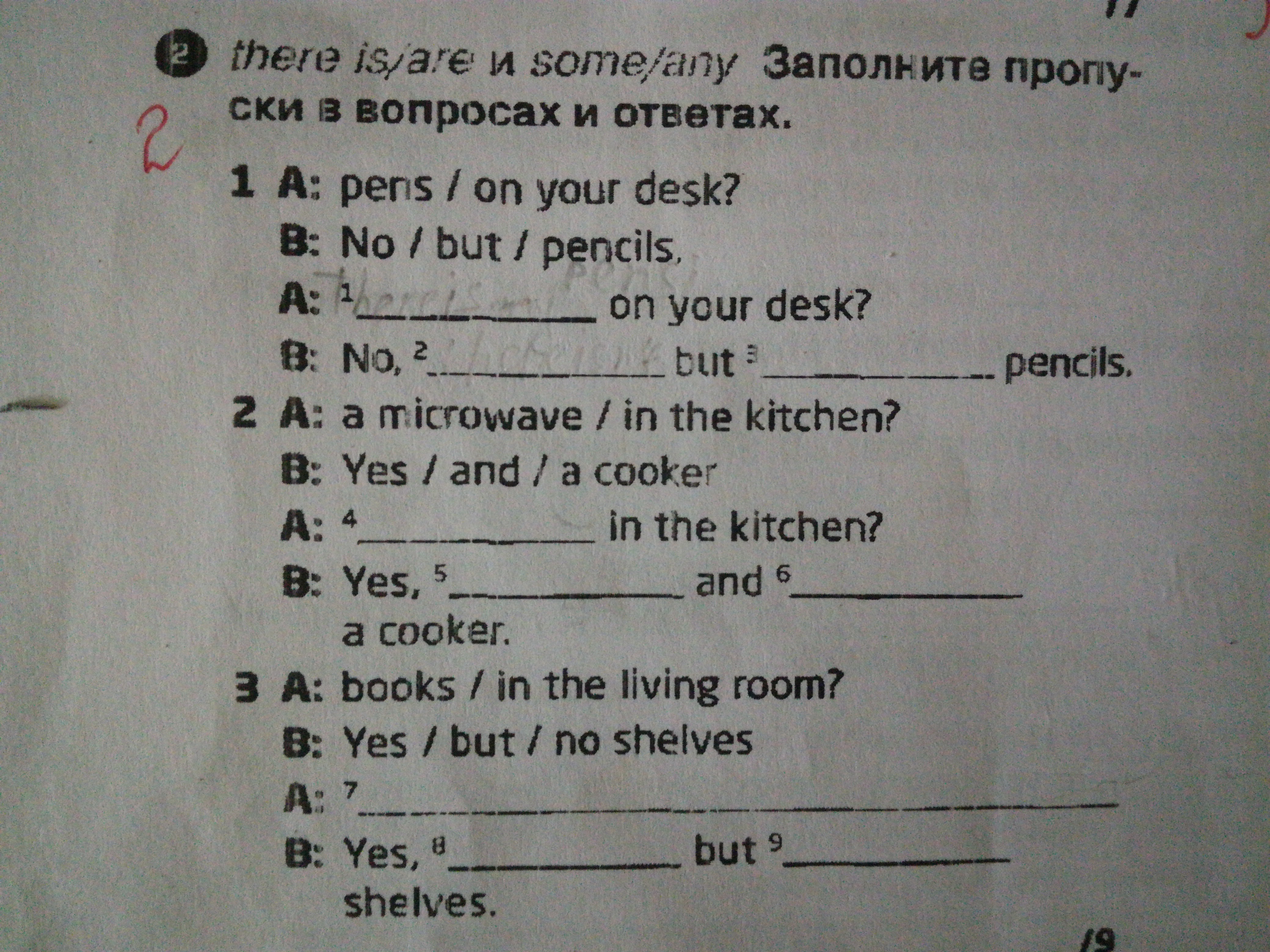 1 - Are there some pens...; 2 - ...there aren't any...; 3 - ...there are some pencils; 4 - Is there a microwave...; 5 - ...there is...; 6 - ...there is...; 7 - Are there some books...; 8 - ...there are...; 9 - ...there aren't any...