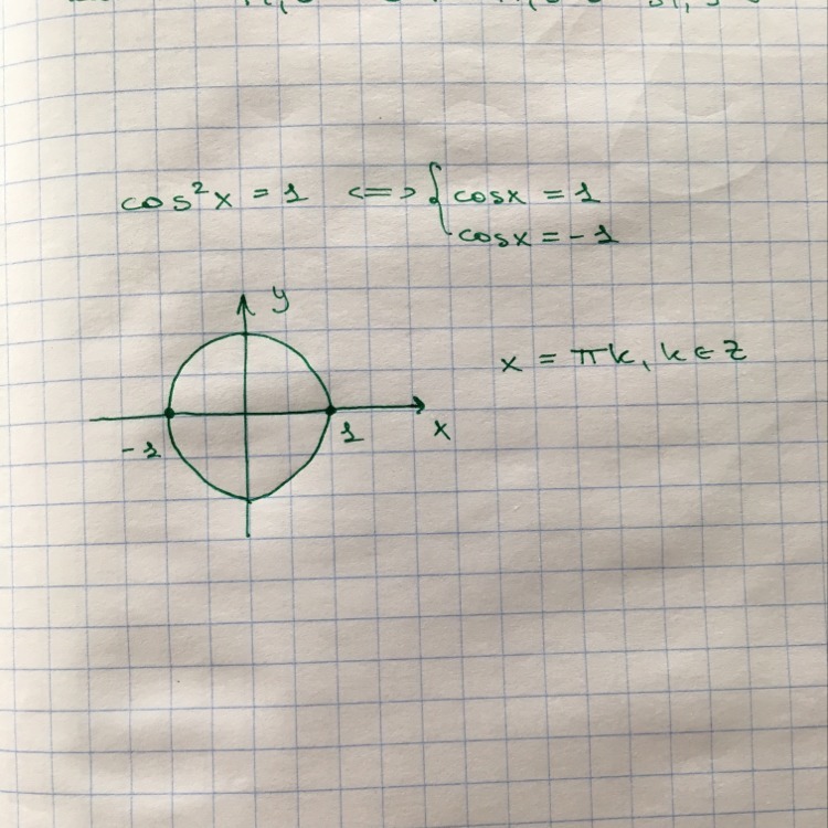 cos^2 x=1 следовательно cosx=1 и cosx=-1 как объединить эти 2 формулы в одну, она должна получиться вот такой: x=pn