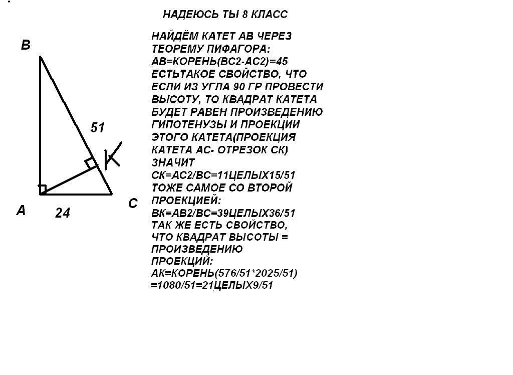 ТАК ЖЕ ПЛОЩАДЬ ЭТОГО ТРЕУГОЛЬНИКА МОЖНО НАЙТИ : ВЫСОТА * ГИПОТЕНУЗА/2=АК*51/2=540. ИЗ ЭТОГО СЛЕДУЕТ, ЧТО АК=21ЦЕЛАЯ9/51
