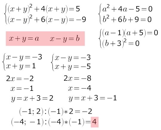 система уравнений заменой сводится к системе двух квадратных уравнений, которые решаются устно (по т.Виета)