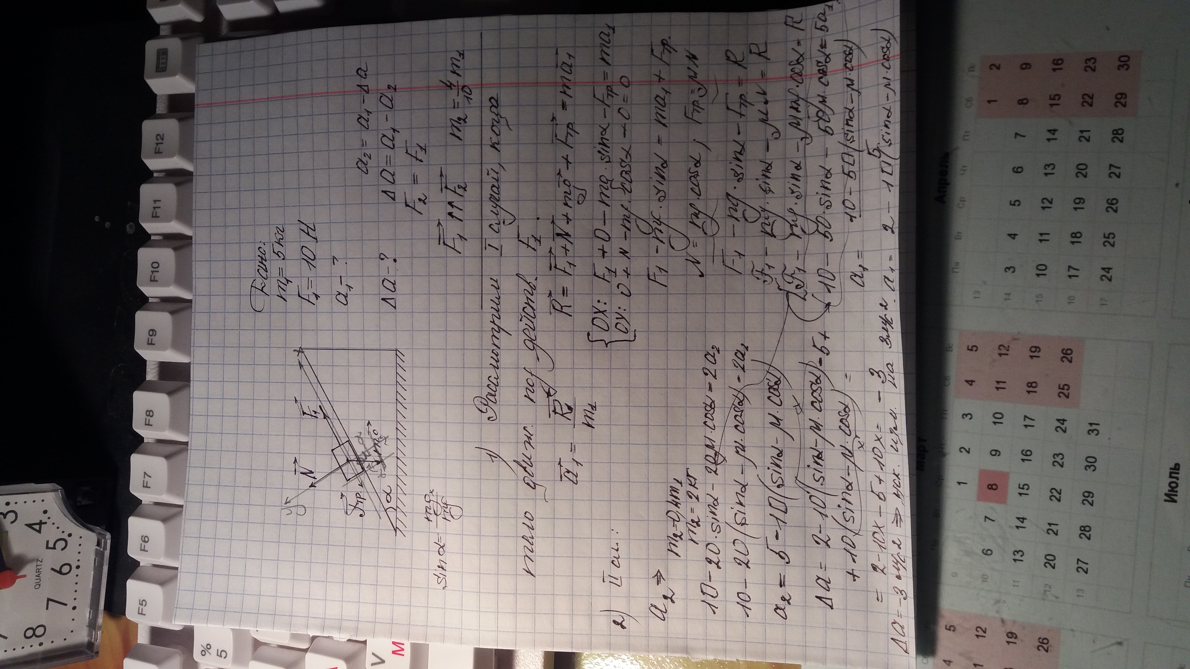К бруску массой m1 = 5 кг, находящемуся на закреплённой наклонной шероховатой плоскости, приложена сила F = 10 Н, направленная вдоль плоскости, как показано на рисунке. При этом брусок движется вверх с ускорением. На какую величину изменится ускорение бруска, если, не изменяя модуля и направления силы заменить брусок на другой — из того же материала, но массой m2 = 0,4 m1? Ответ выразите в м/с2.