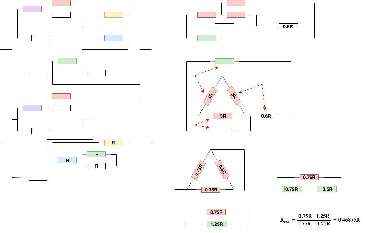 Будем упрощать схему методом последовательного преобразования. Решение показано во вложении. Участвующие в изменении или преобразовании резисторы выделены цветом. В принципе, решение должно быть понятно, за исключением, быть может, момента преобразования звезды в треугольник. Это известное преобразование и если все три сопротивления резисторов равны, соответствующие эквивалентные сопротивления утраиваются. Красными пунктирными стрелками указаны пары, образующие параллельные соединения.