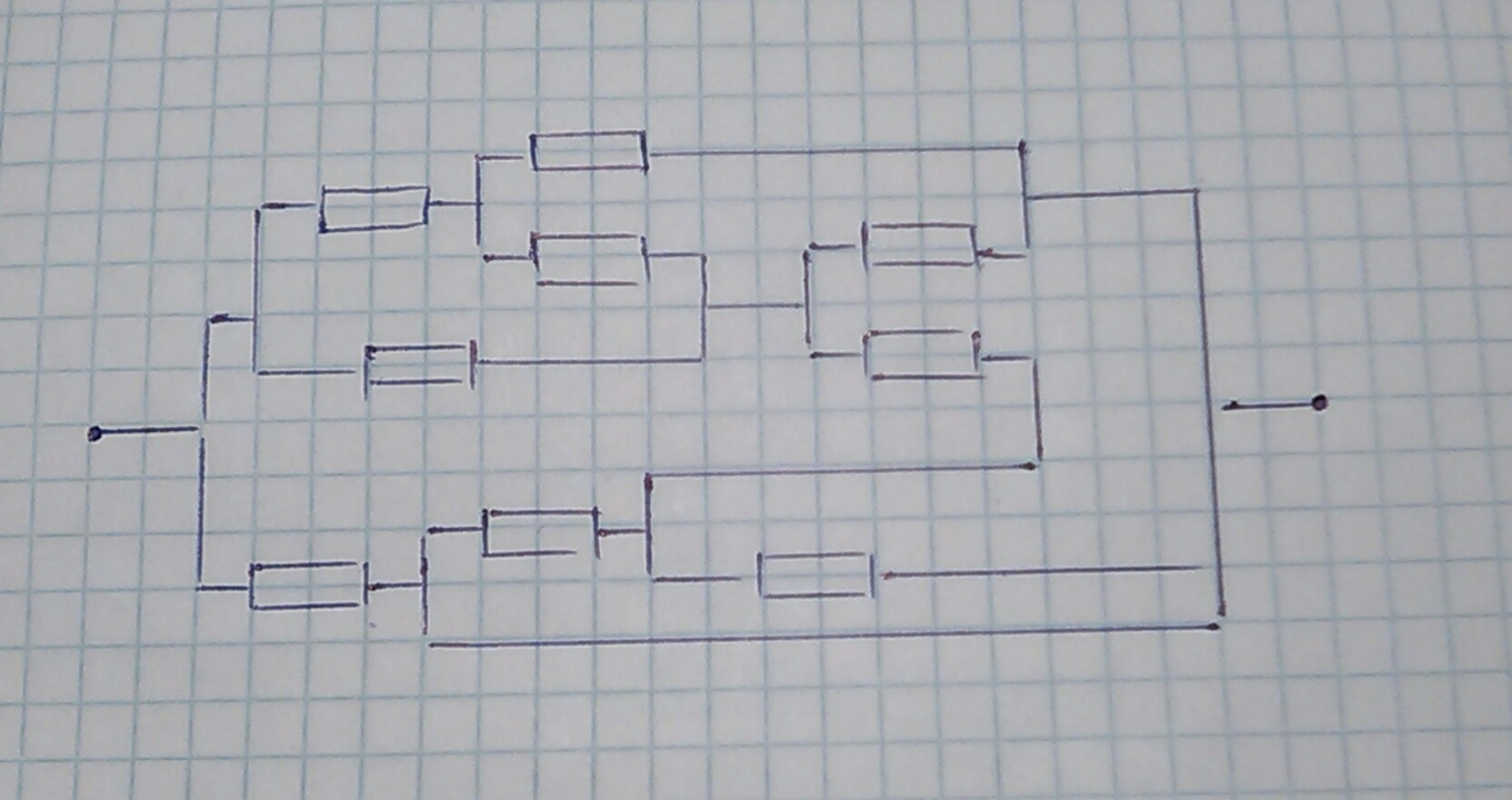 Помогите разобраться со схемой. Надо найти общее сопротивление цепи, если все резисторы одинаковы и их сопротивление R. Спасибо!