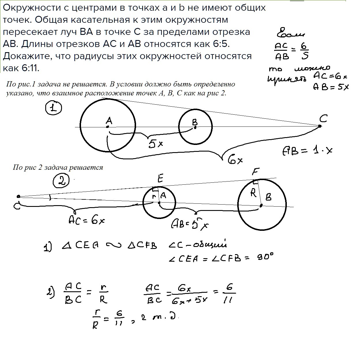 Окружности с центрами в точках a и b не имеют общих точек. Общая касательная к этим окружностям пересекает луч BA в точке C за пределами отрезка AB. Длины отрезков AC и AB относятся как 6:5. Докажите, что радиусы этих окружностей относятся как 6:11.