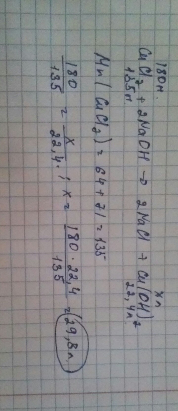 С помощью уравнения CuCl₂ + 2NaOH = 2NaCl + Cu(OH)₂ определите, какое количество Cu(OH)₂ получится, если взять 180 грамм хлорида меди CuCl₂ ?