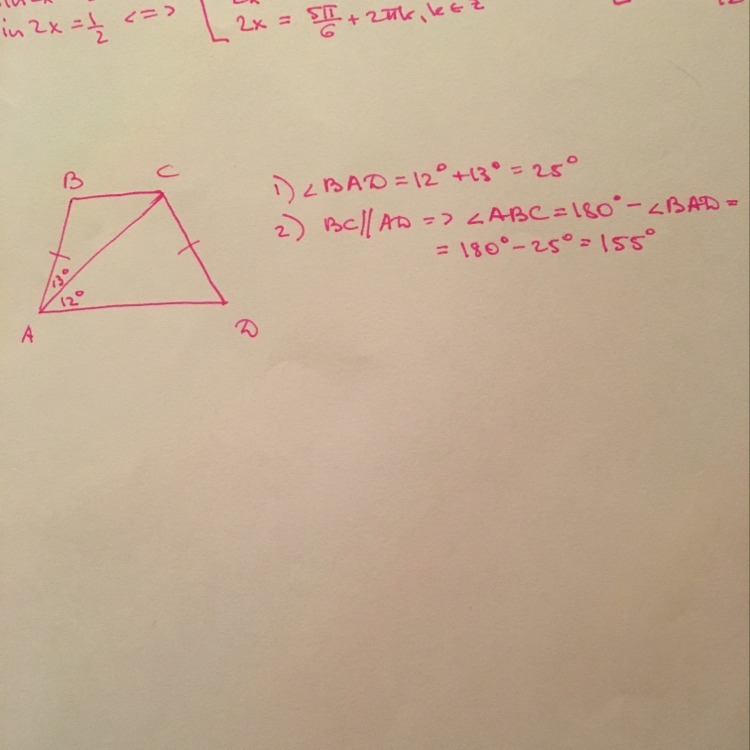 Найдите больший угол равнобедренной трапеции ABCD, если диагональ АС образует с основанием AD и боковой стороной АВ углы, равные 12° и 13° соответственно. Ответ дайте в градусах.