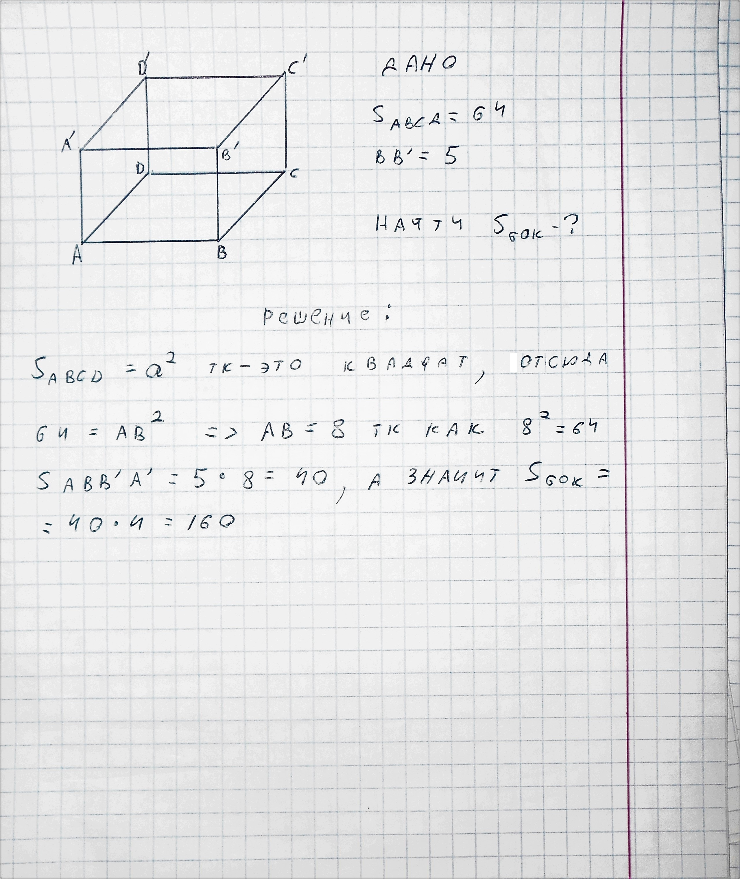 Найдите, чему равна площадь боковой поверхности прямой призмы, если в основании призмы лежит квадрат площадью 64 см^2, а высота призмы равна 5 см.