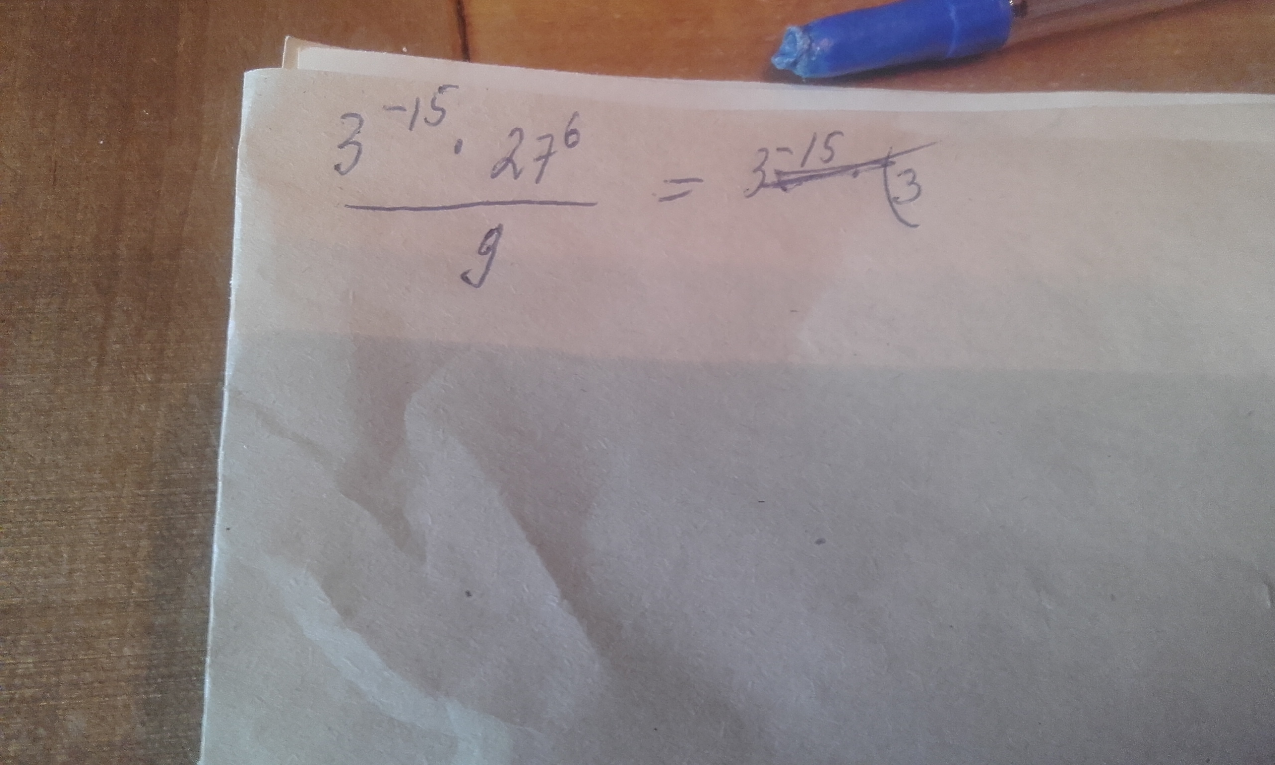 3⁻¹⁵*27⁶/9=3⁻¹⁵*(3³)⁶/3²=3⁻¹⁵*3¹⁸/3²=3⁽⁻¹⁵⁺¹⁸⁻²⁾=3