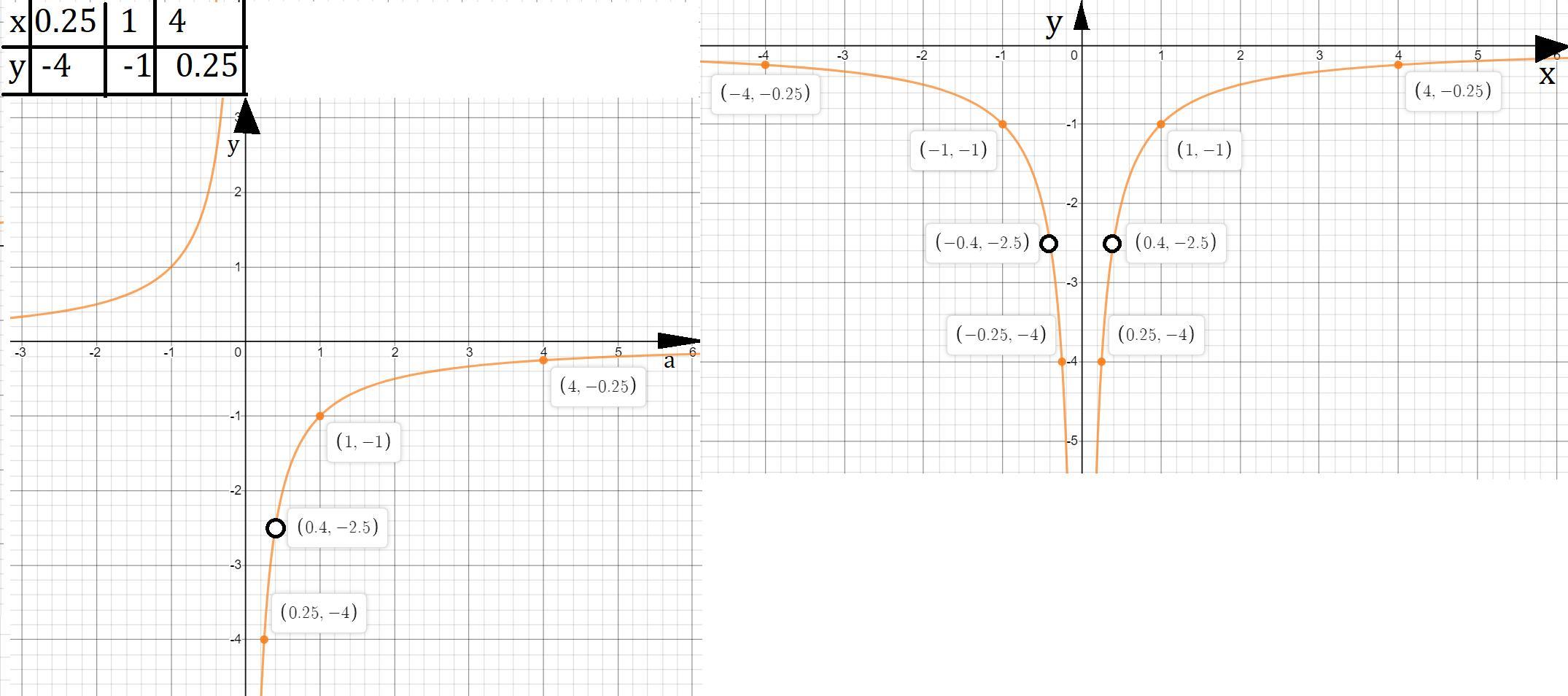 Получившиеся функция представляет из себя гиперболу, асимптоты которой y=0 и x=0, гипербола лежит во 2 и 4 четверти относительно своих асимптот. Т.к. нас интересует только то, что справа оси Оу, мы можем не думать о том, как именно будет расти функция во 2 четверти, а вот для 4 четверти мы составим таблицу точек. Не забываем выколоть точку при которой, исходная функция после замены не определена, далее отражаем как было сказано и получаем график нашей первоначальной функции.