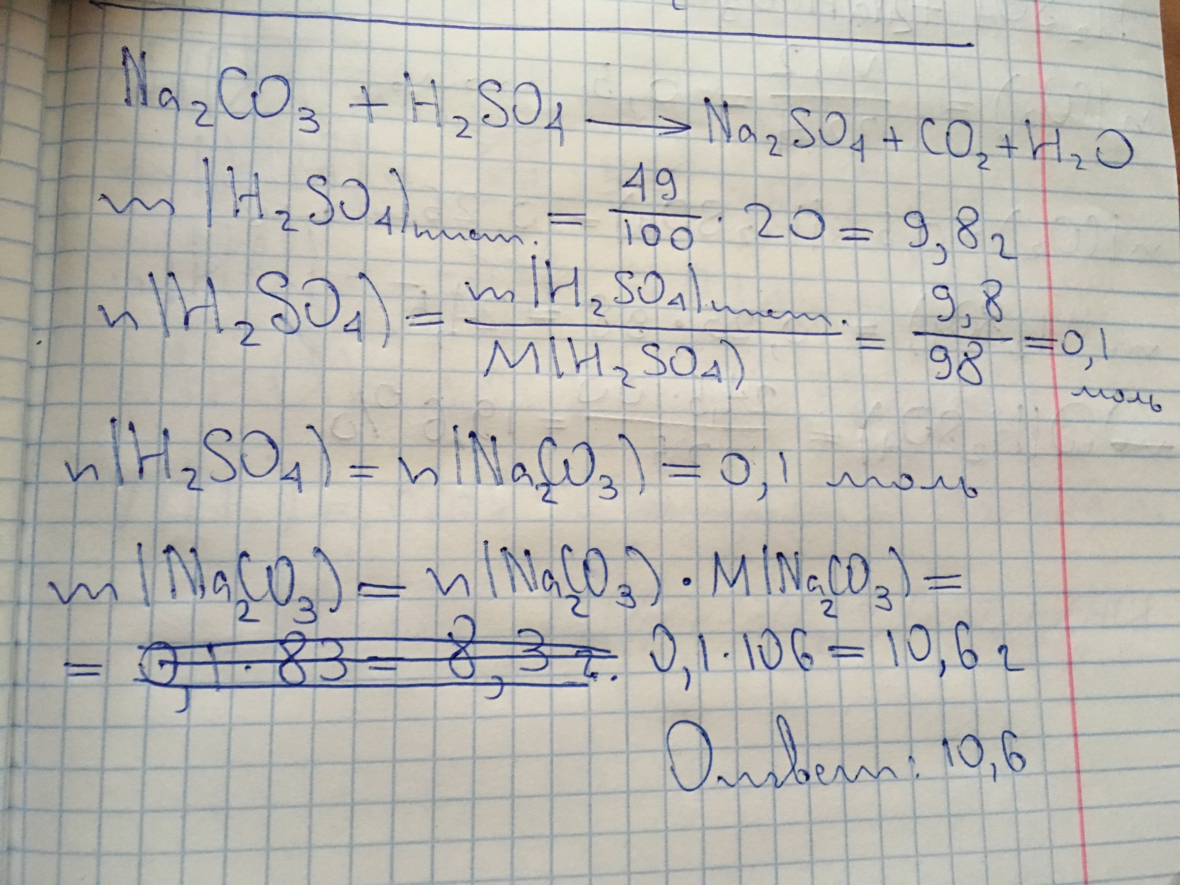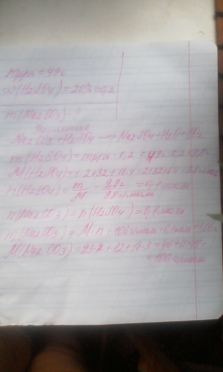 вычислите массу карбоната натрия, который потребуется для полной нейтрализации 49 г 20%-ного раствора серной кислоты