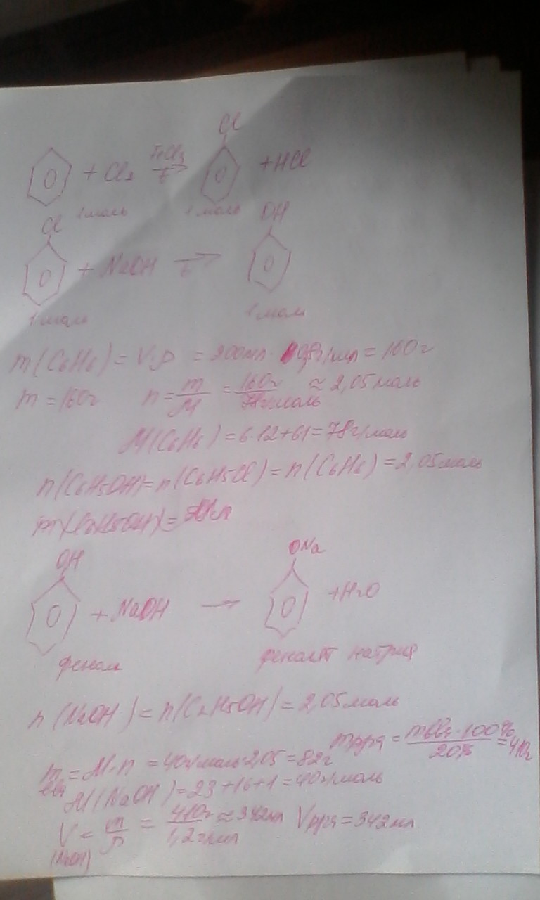 ВЫчислите объем 20%-го раствора гидроксида натрия (р- 1.2 г/мл) который потребуется для нейтрализации фенола полученого из 200 мл бензола (р- 0,8 г/мл)