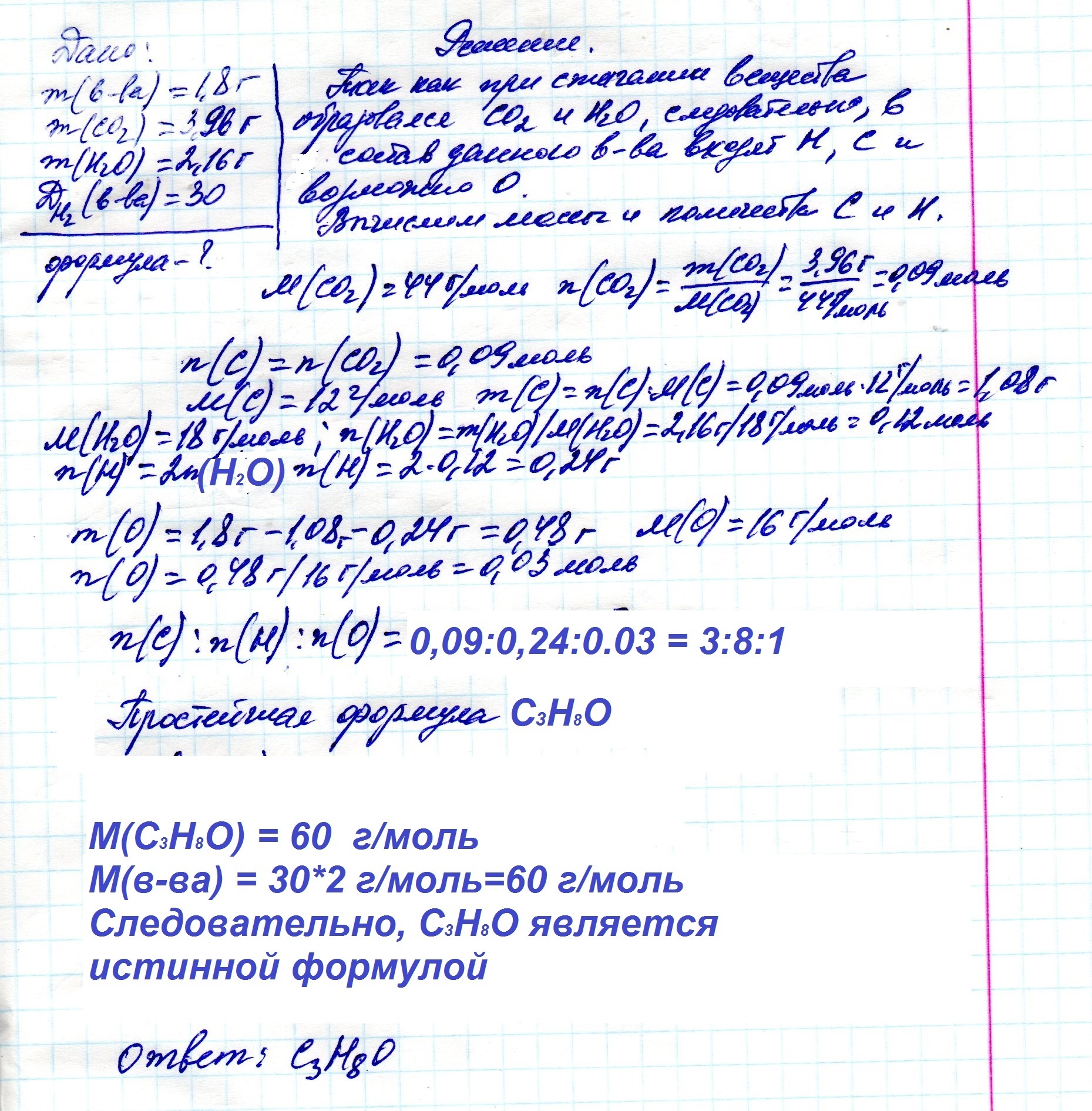 При сгорании 1,8 грамм вещества, образовалось, 3,96 грамм оксида углерода (IV) и 2,16 грамм воды. Относительная плотность вещества по водороду 30. Определить формулу. Помогите, прошу