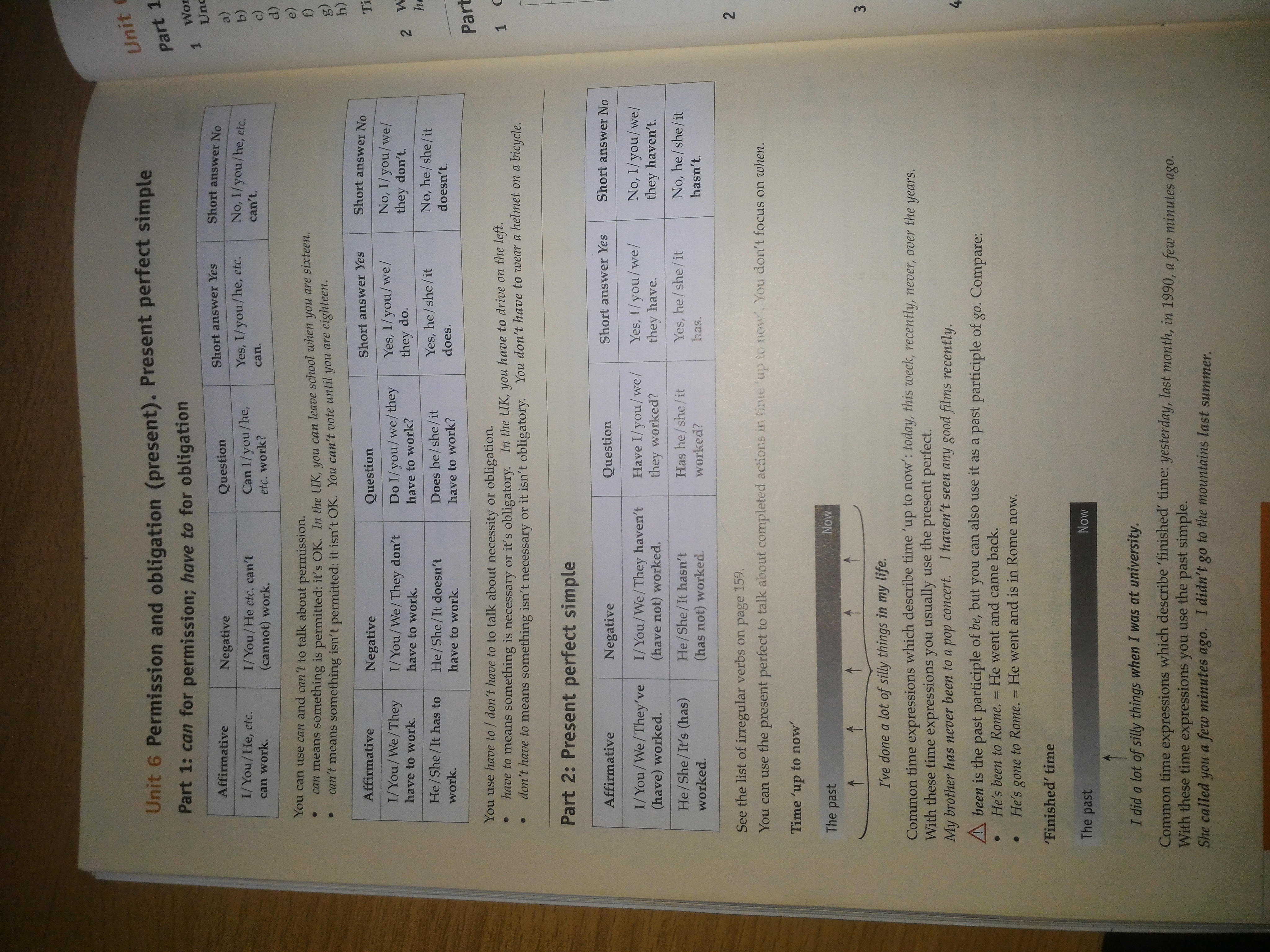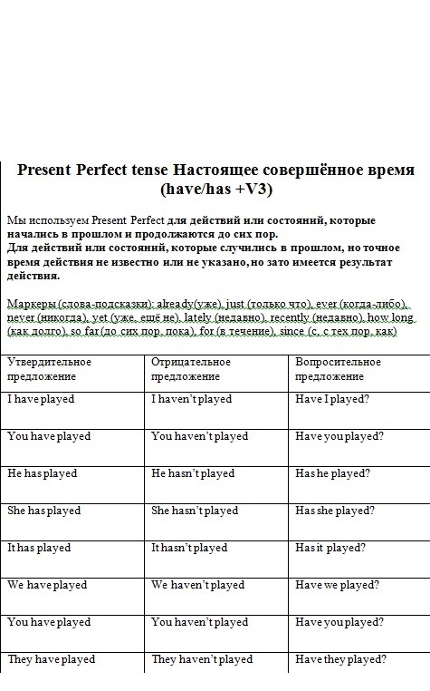 3 табличка - Present Perfect. Прилагаю свою таблицу к ней. В ней видно, что для отрицательных предложений мы добавляем к have и has отрицательную частицу not (n't), а для вопросительных предложений have и has выносим на первое место перед подлежащим.