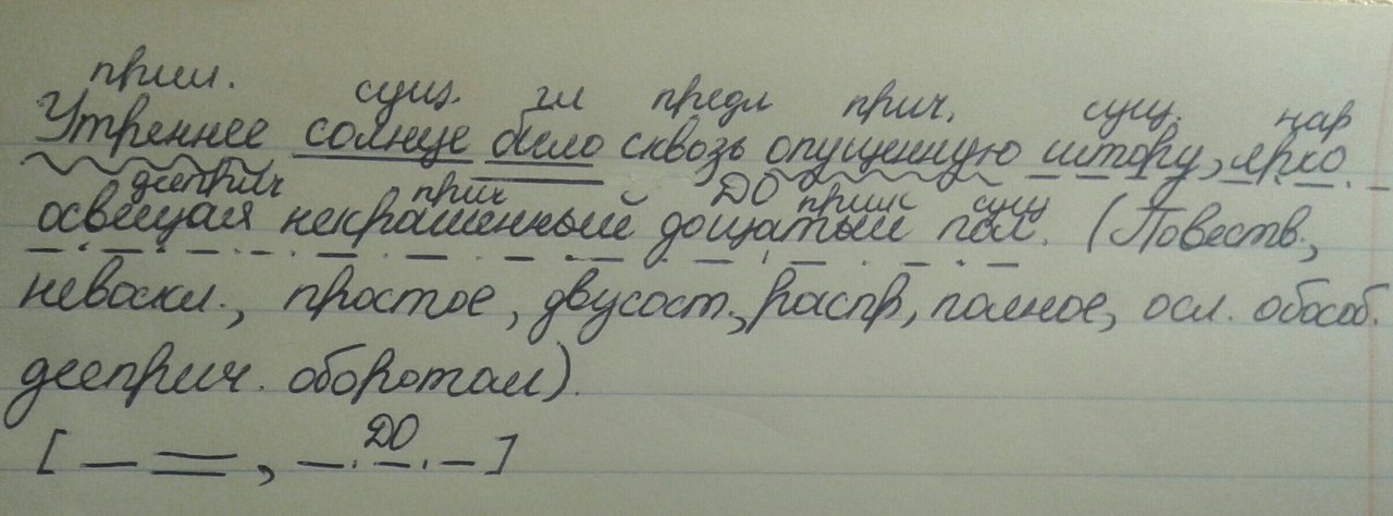 синтаксичекий разбор утренне солнце было сквозь опущенную штору ,ярко освещая некрашенный дощатный пол