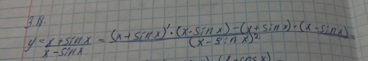 y= frac{x+sinx}{x-sinx} \\y'= frac{(1+cosx)(x-sinx)-(x+sinx)(1-cosx)}{(x-sinx)^2} = frac{2(xcdot cosx-sinx)}{(x-sinx)^2}
