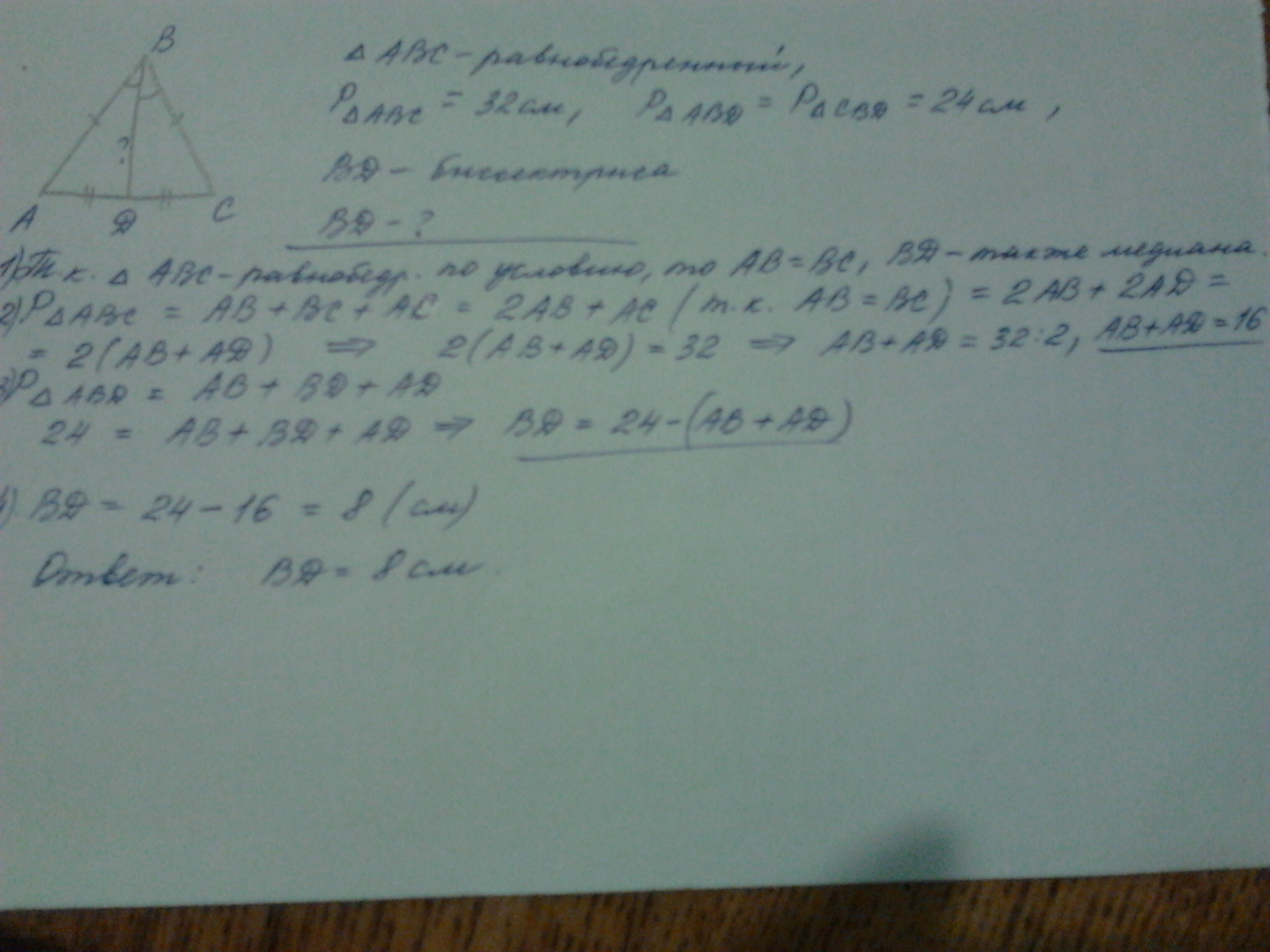 Периметр равнобедренного треугольника равен 32 см. Биссектриса,
