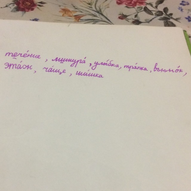 ТечЕние, мишурА, улЫбка, трЯпка, вьюнОк, этАж, чАще, шИшка.