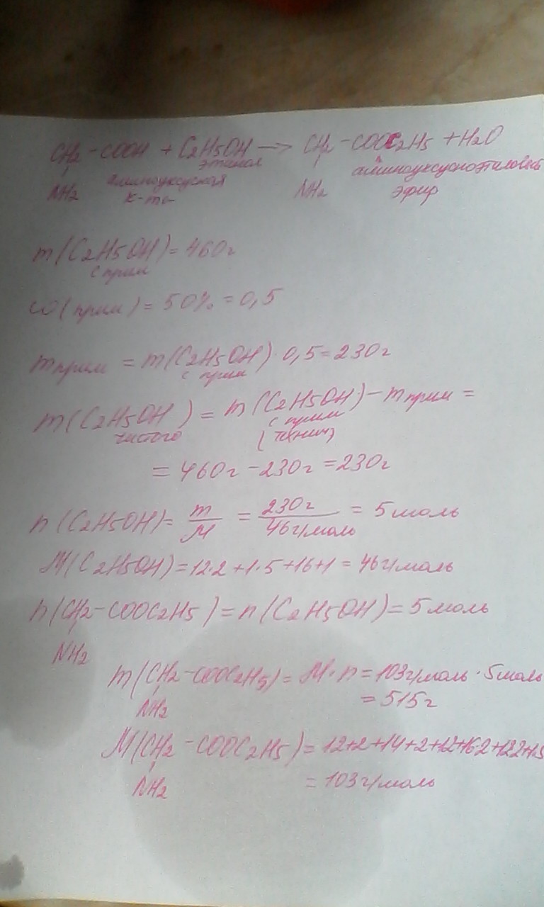 Сколько грамм образуется аминоуксусноэтилового эфира при взаимодействии 460 этанола, содержащего 50% примесей, с амиуноуксосной кислотой.