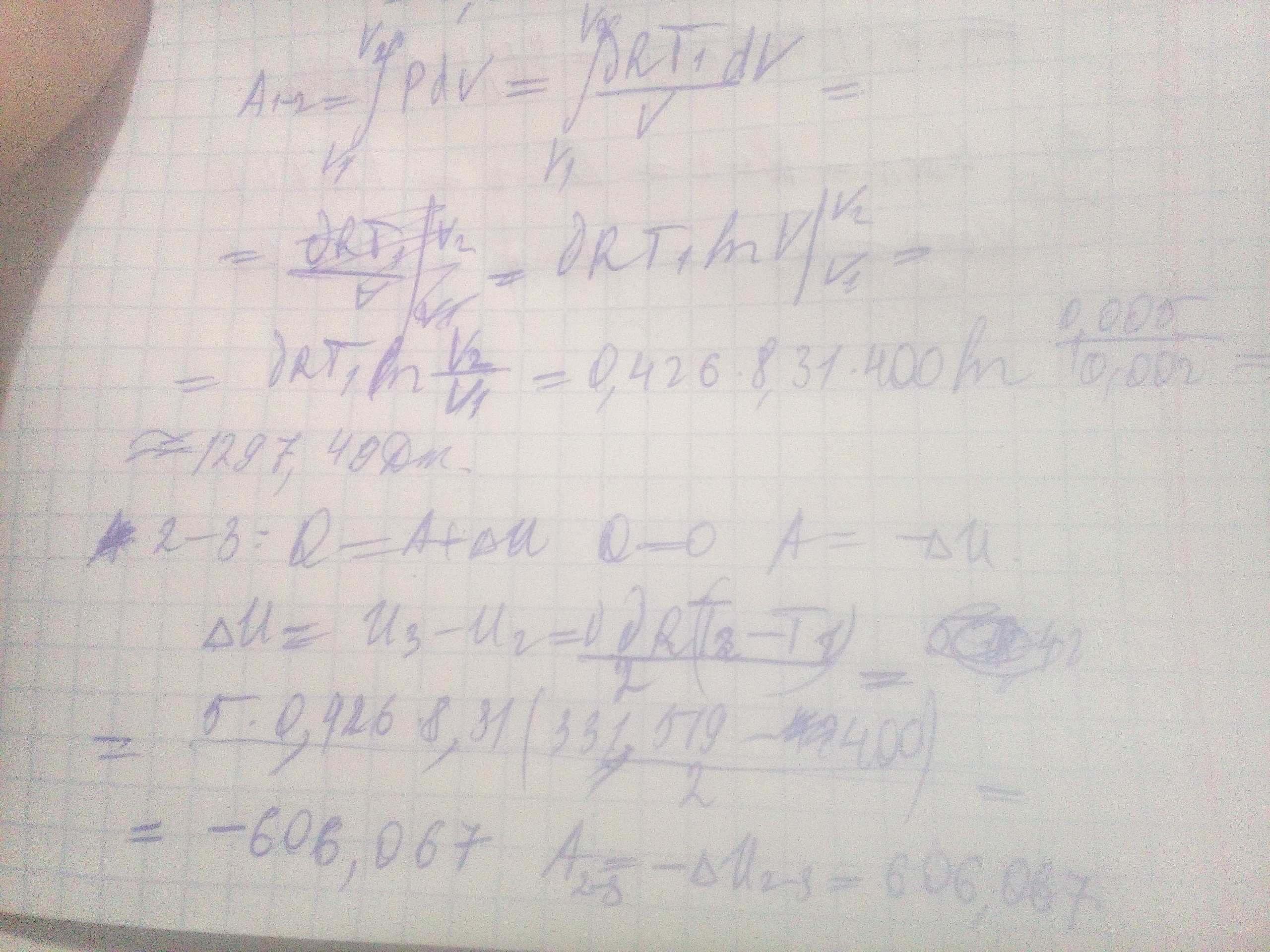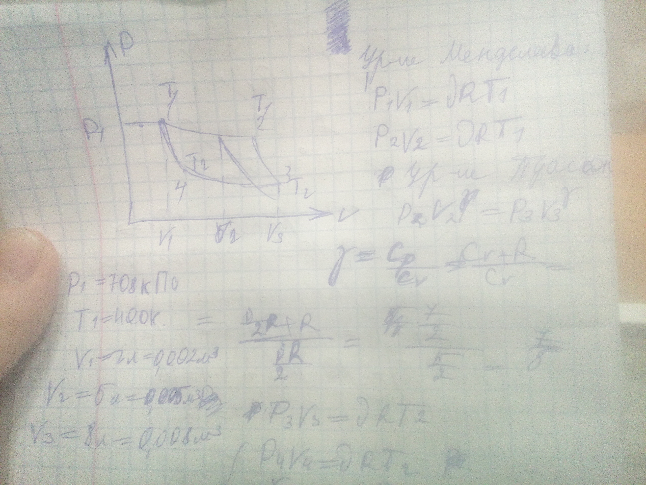 Идеальная тепловая машина работает по циклу Карно. Воздух при давлении P1=708 кПа и температуре T1=400K занимает обьем V1=2л. После изотермического расширения воздуха занял обьем V2=5л, после адиабатического расширения обьем возрос до V3=8л. Найти а) параметры пересечения изотерм и адиабат. б) работу, совершаемую на каждом участке цикла. в) полную работу в цикл. г) КПД цикла. д) количество теплоты Q1 и Q2, Q1 - полученное в цикле от нагревателя и Q2 - отданное холодильнику.