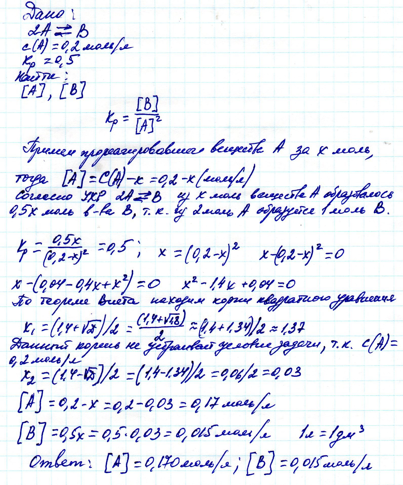 Реакция протекает по уравнению 2А ↔ В. Начальная концентрация вещества А равна 0,2 моль/дм3. Константа равновесия реакции равна 0,5. Определите равновесные концентрации веществ А и В.