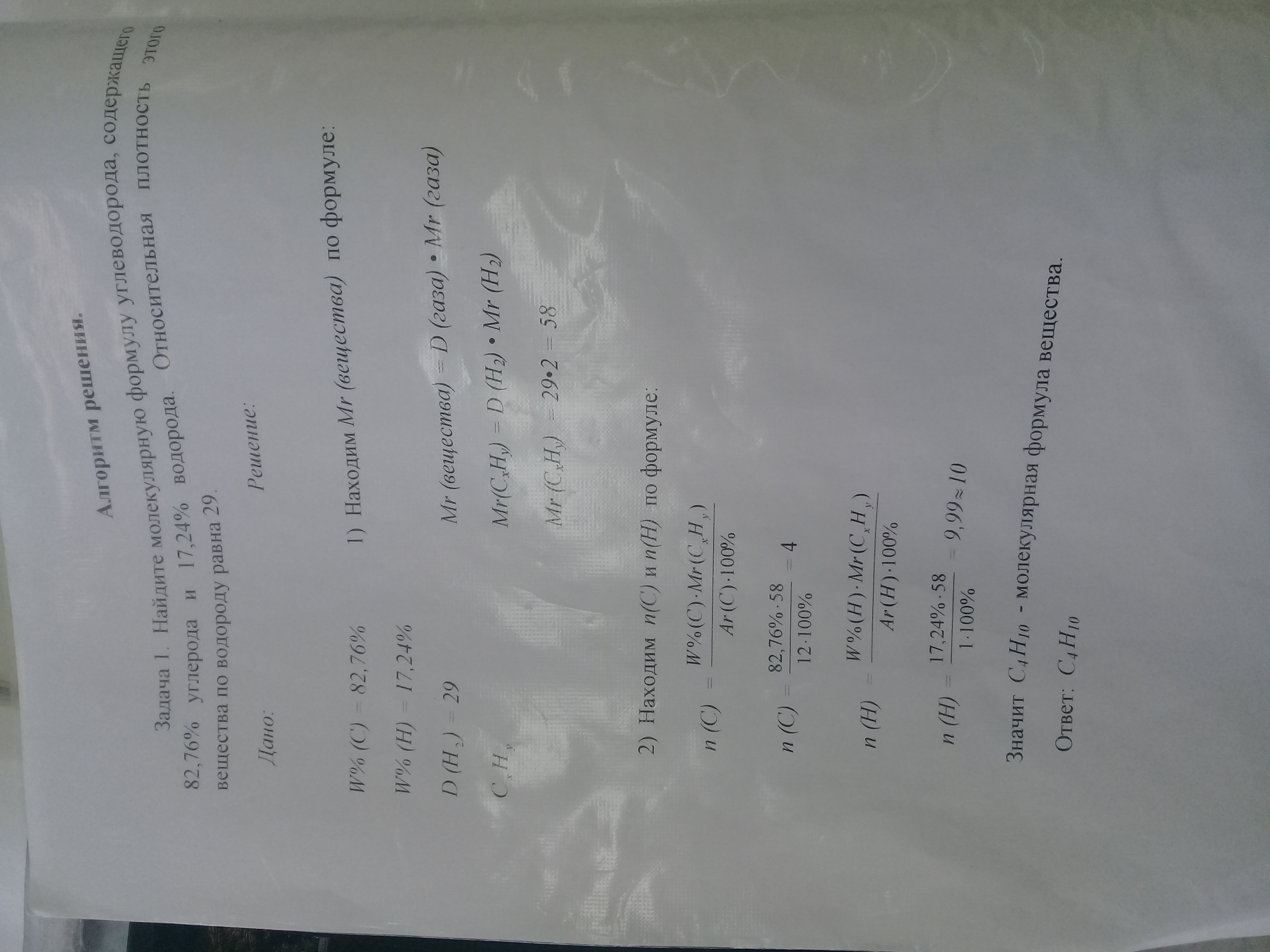 Выведите формулу органического вещества,имеющего следующий состав 38,7% углерода, 9.7 % водорода, 51,6 кислорода.Относительная плотность этого вещества по водороду равна 31 .Решите по этому Алгоритму .Надо решить ток по этому алгоритму .