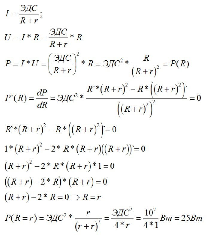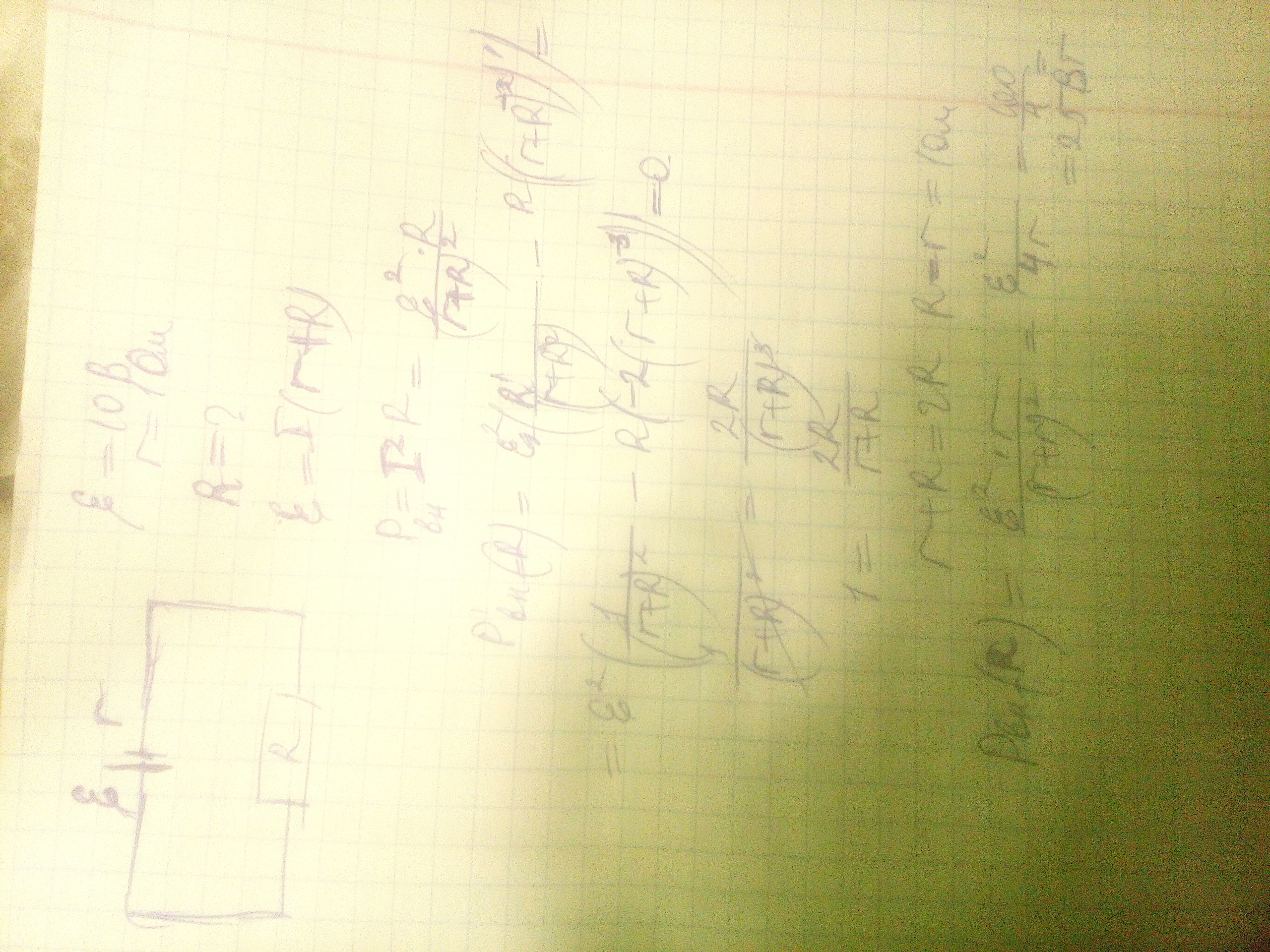 чтобы найти эту величину нужно найти зависимость мощности от сопротивления, потом найти производную по сопротивлению, приравнять производную нулю и из получившегося уравнения найти сопротивление R