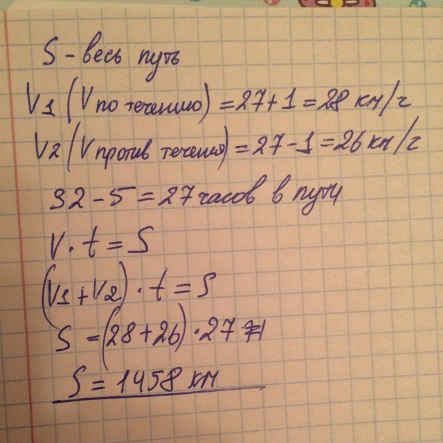 Из А в Б выехал катер, доехав до точки Б он остановился на 5 часов, потом поехал обратно и все это у него заняло 32 часа. Найдите весь пройденный им путь, если собственная скорость катера 27 км/ч а скорость течения реки 1 км/ч