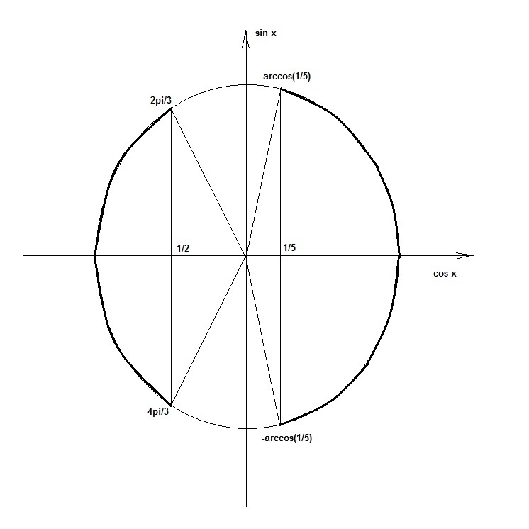 x ∈ [2pi/3 + 2pi*k; 4pi/3 + 2pi*k] U [-arccos(1/5) + 2pi*k; arccos(1/5) + 2pi*k]