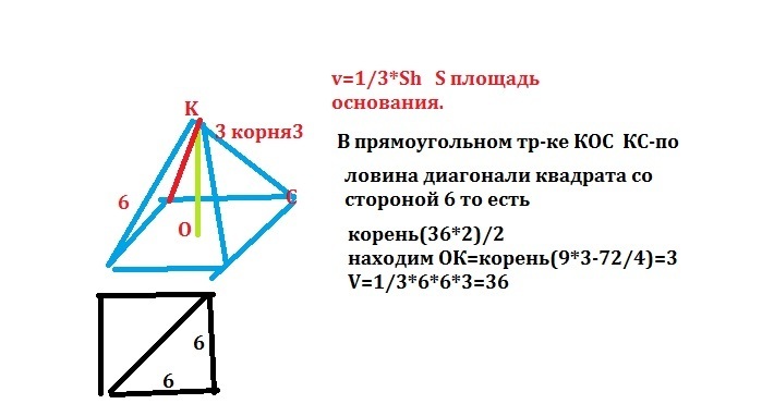 В правильной четырёхугольной пирамиде сторона основания равна 6 см, боковое ребро равно 3корня из 3