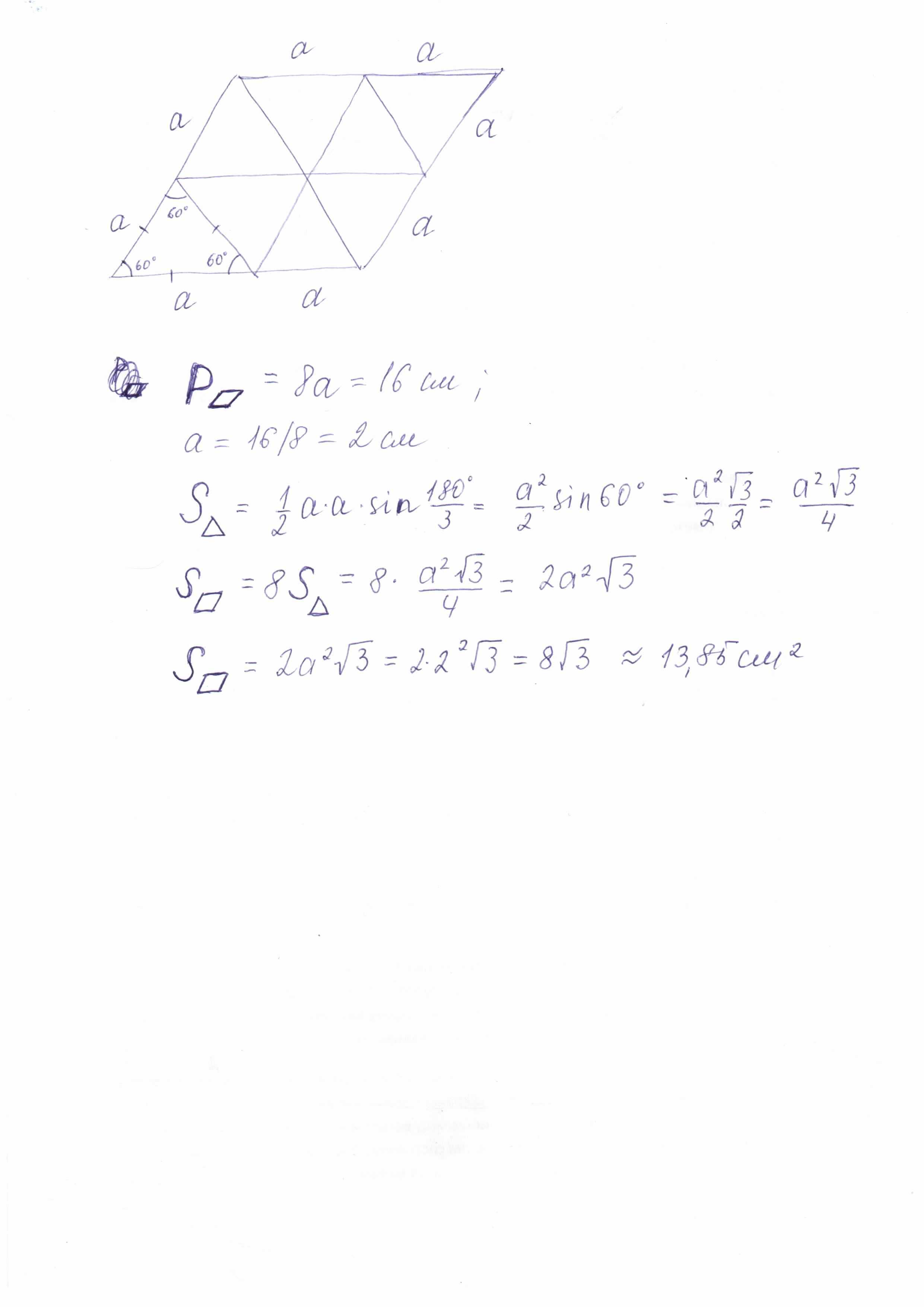 из восьми равных правильных треугольников составили четырехугольник. Вычислите площадь этого четырехугольника,если его периметр равен 16 см