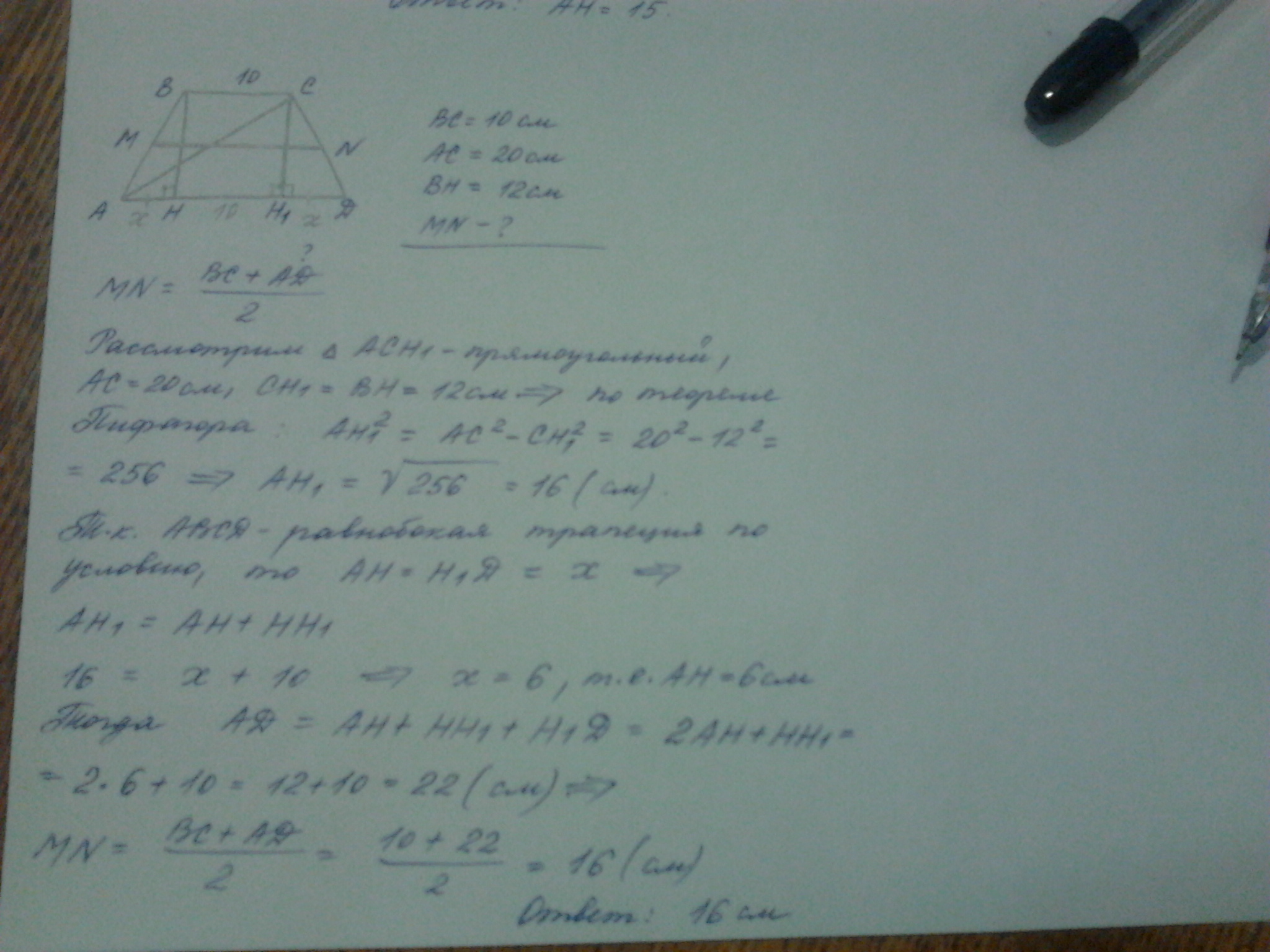 Дана равнобокая трапеция с меньшим основанием 10 см, диагональю 20 см и высотой 12 см. Найдите среднюю линию трапеции