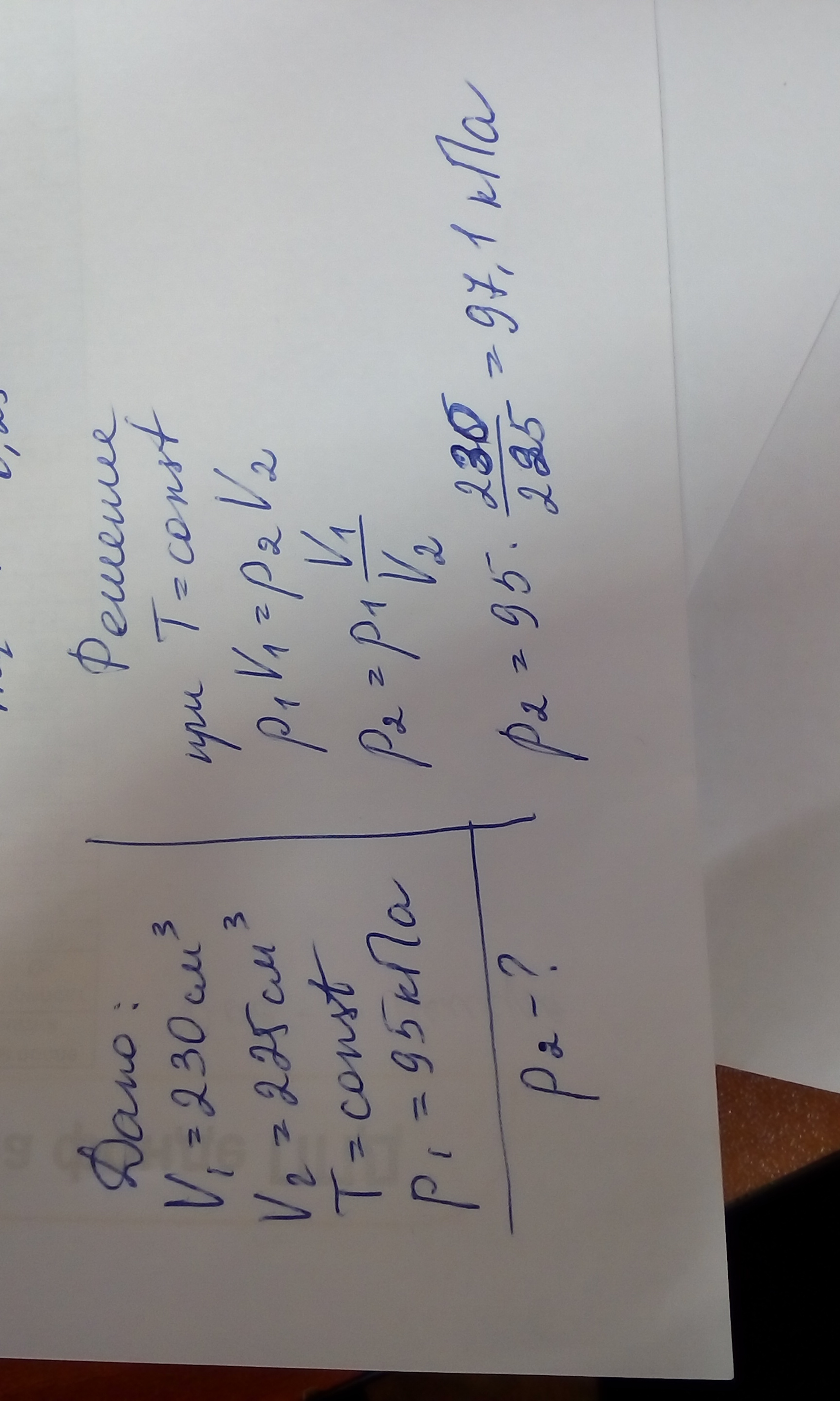 При каком давлении газ, занимавший объем 230 см3, будет сжат до объема 225 см3, если температура газа останется неизменной? Первоначальное давление газа равно 95 кПа