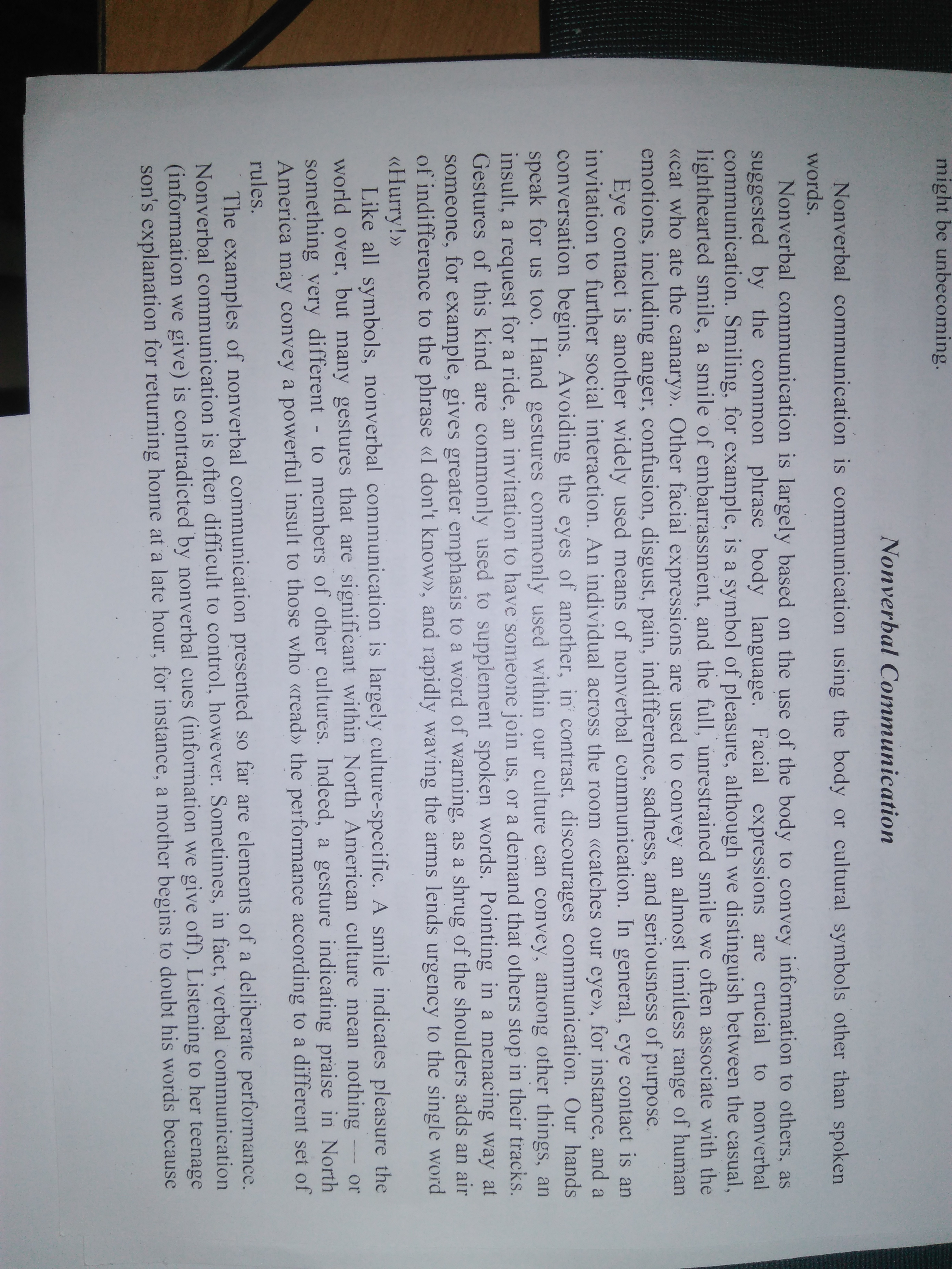 It is spoken in detail about why the facial expressions are crucial to nonverbal ommunication. According to the text, facial expression are used to onvey almost limitless range of human emotions. Further the author writes about the eye contact and the way it an be used to encourage or discourage social interaction.The article goes on to say that the hands speak too and explains the way we can interpret their language. It is pointed out that nonverbal communication is largely culture-specific. Author gives us the examples of how meaning of the gestures can differ in different cultures. He also writes that nonverbal communication is difficult to control. In conclusion the author describes how nonverbal communication may provide clues to verbal deception.