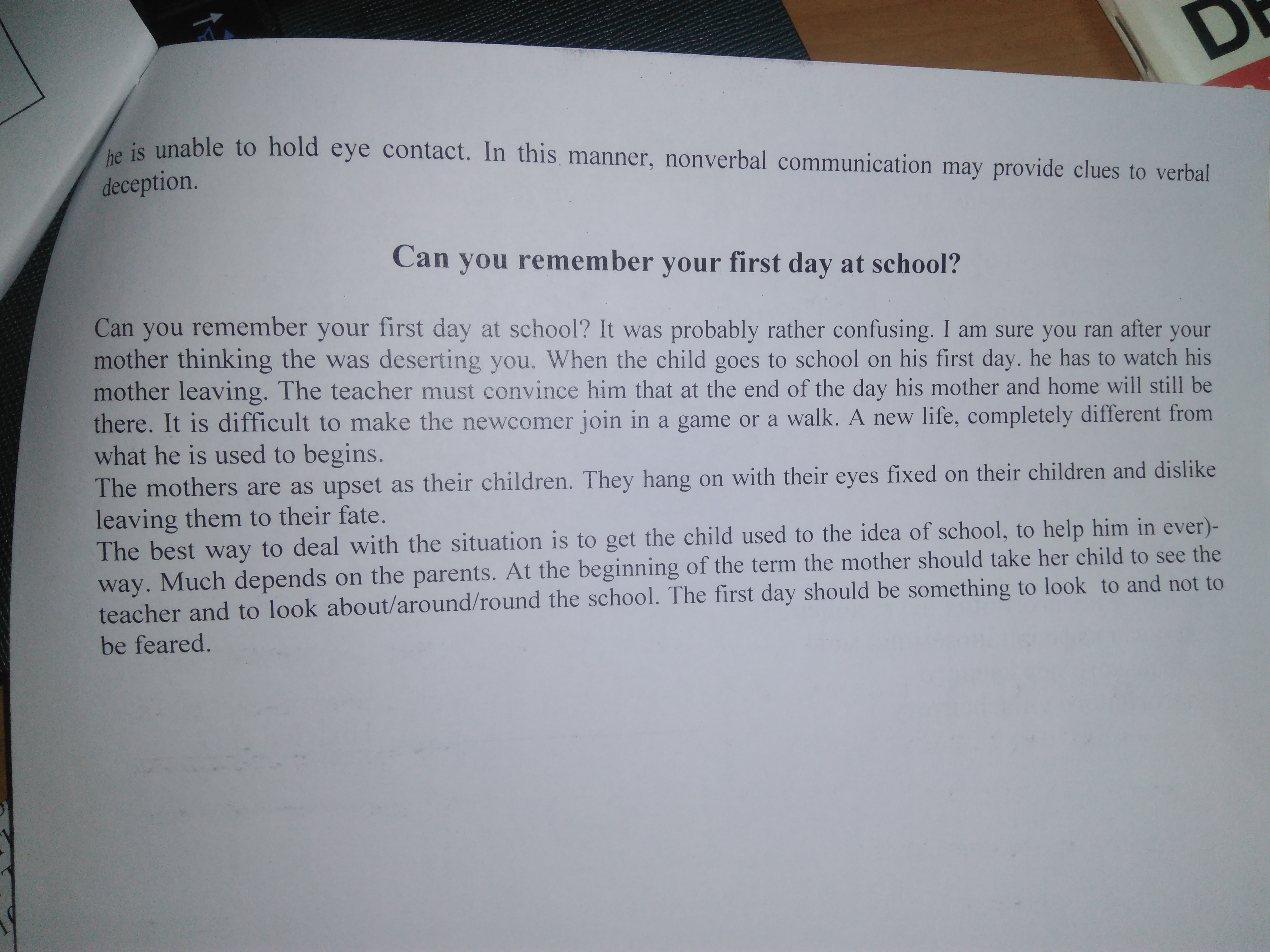 The headline of the article I have read is "Can you remember your fisrst day at school". Unfortunately the author's name is not mentioned. The article is about the first day at school. It is pointed out that the first day at school can be rather distressing both for child and for his mother and difficult for the teacher.