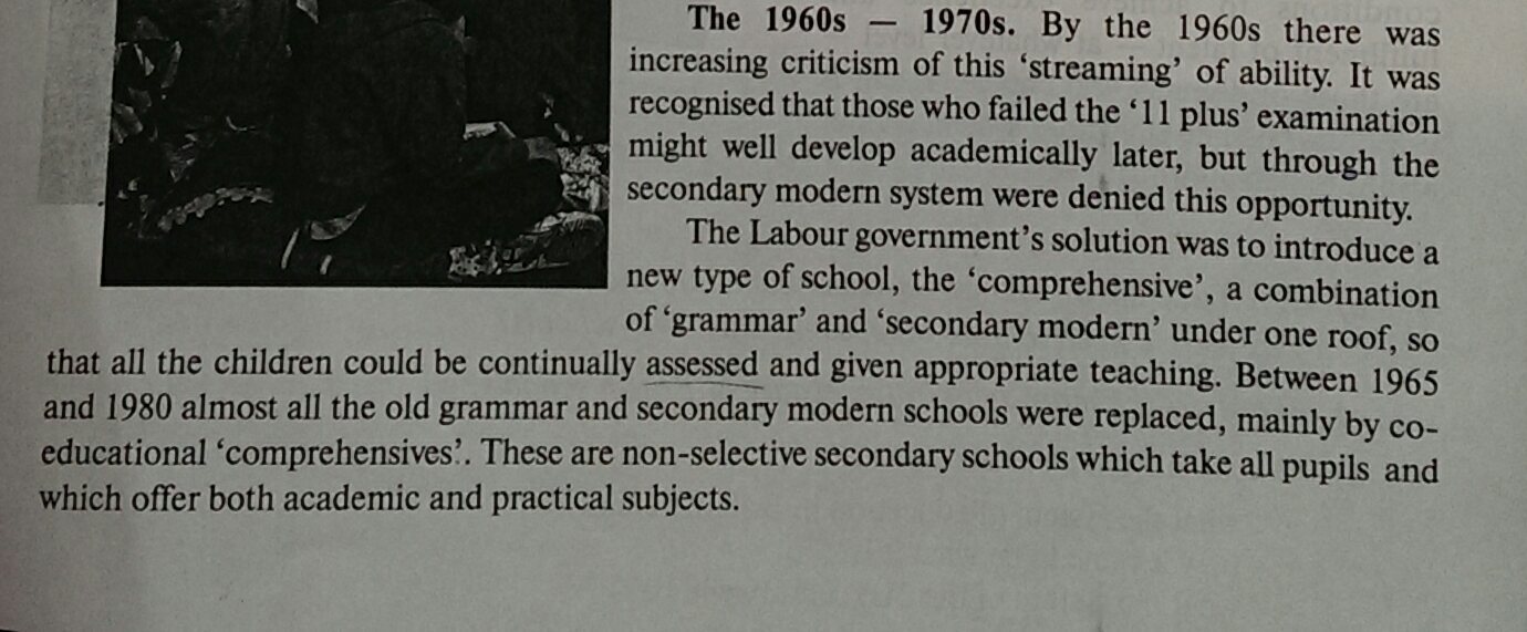 1960-е - 1970-е годы. Было обнаружено, что к 1960-м годам возрастала критика этой «потоковой» способности. Было признано, что те, кто не прошел экзамен «плюс плюс», могли развиваться в академическом плане позже, но через систему вторичных модемов была лишена этой возможности. Решение лейбористского правительства заключалось в том, чтобы Ввести новую школу, всеобъемлющую «комбинацию грамматики» и «второстепенную моду» под одной крышей, чтобы все дети могли постоянно оцениваться и получать соответствующее обучение. В период с 1965 по 1980 год почти все старые школы грамматики и вторичные современные школы были заменены, в основном, совместными учебными программами. Это неселективные средние школы, в которых участвуют все ученики и которые предлагают как академические, так и практические предметы.
