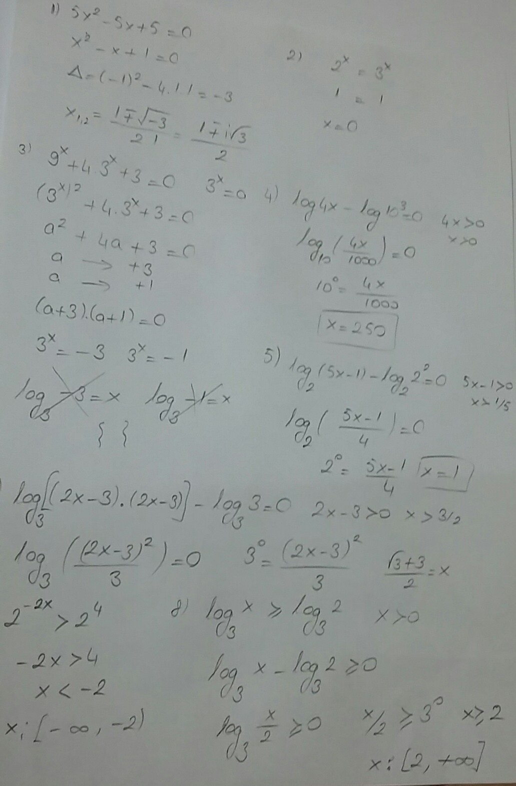 1)5х^2-5х+6=1 2)2^х=3^х 3)9^х+4 *3х+3=0