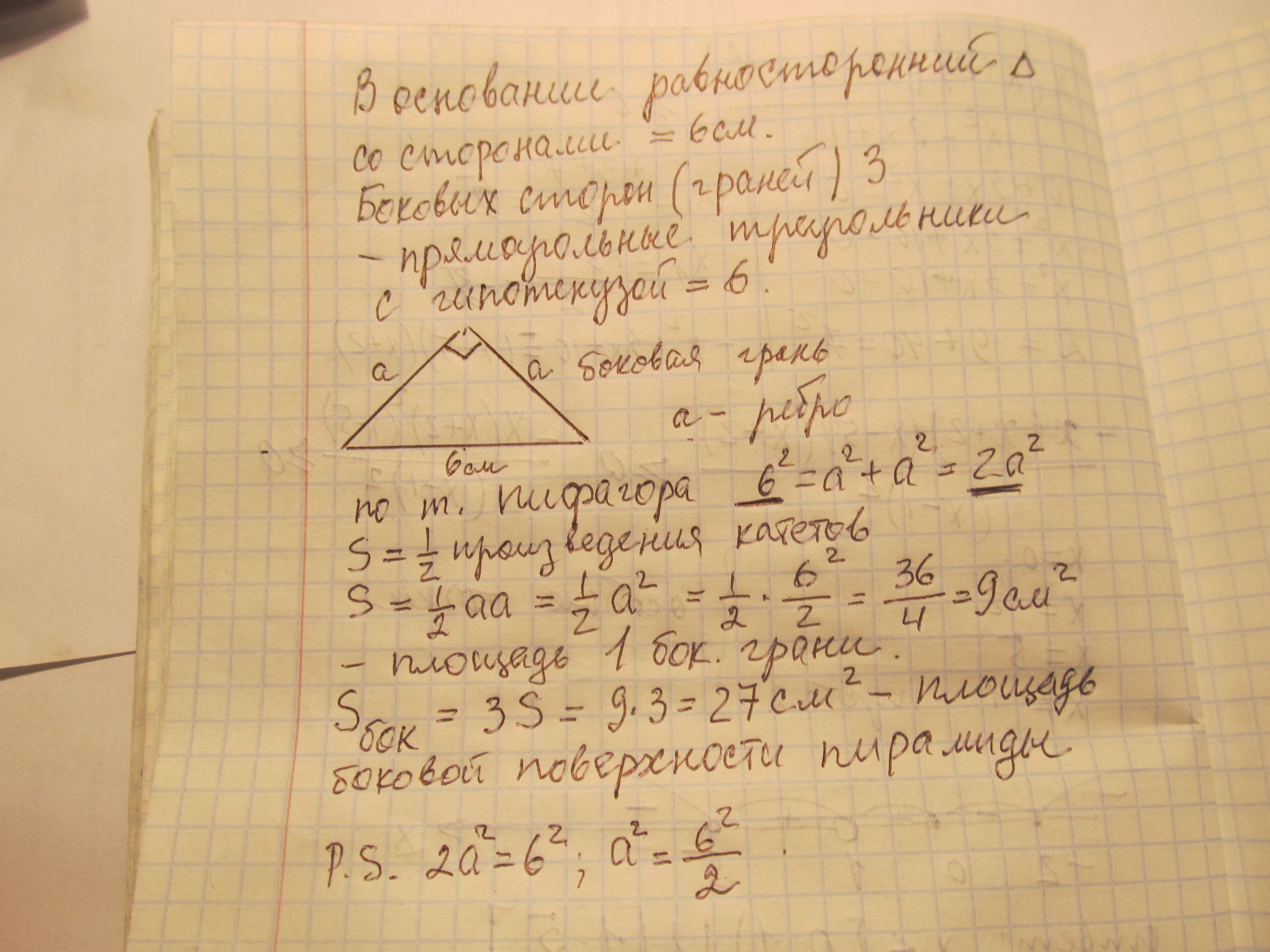 Чему равна площадь боковой поверхности правильной треугольной пирамиды, у которой сторона основания равна 6 см, а боковое ребро взаимно перпендикулярны.