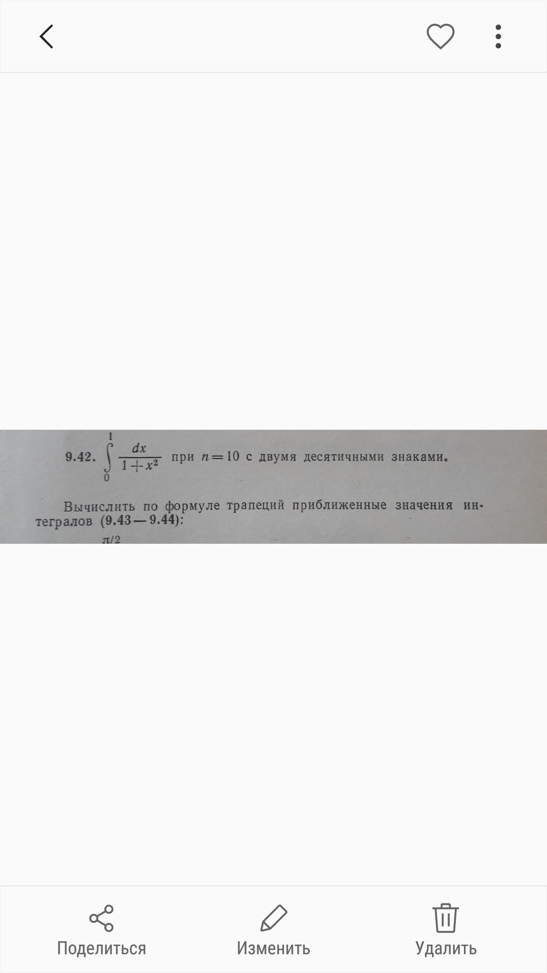 ![intlimits^b_a { f(x) } , dx =h( frac{y_0+y_n}{2} +y_1+y_2+...+y_{n-1})+R_n;\ R_n leq frac{h^2}{12} (b-a)M_2, M_2= max_{[a;b]} [f'(x)] intlimits^b_a { f(x) } , dx =h( frac{y_0+y_n}{2} +y_1+y_2+...+y_{n-1})+R_n;\ R_n leq frac{h^2}{12} (b-a)M_2, M_2= max_{[a;b]} [f'(x)]](https://tex.z-dn.net/?f=intlimits%5Eb_a+%7B+f%28x%29+%7D+%2C+dx+%3Dh%28+frac%7By_0%2By_n%7D%7B2%7D+%2By_1%2By_2%2B...%2By_%7Bn-1%7D%29%2BR_n%3B%5C+R_n+leq+frac%7Bh%5E2%7D%7B12%7D+%28b-a%29M_2%2C++M_2%3D+max_%7B%5Ba%3Bb%5D%7D+%5Bf%27%28x%29%5D)