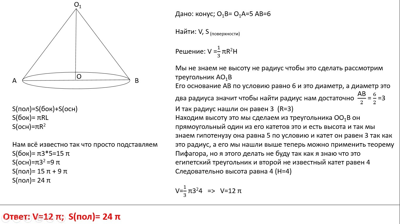 осевое сечение конуса равнобедренного треугольника две стороны которого равны 5 см, а третья сторона 6 см. Найти объем и площадь поверхности конуса.