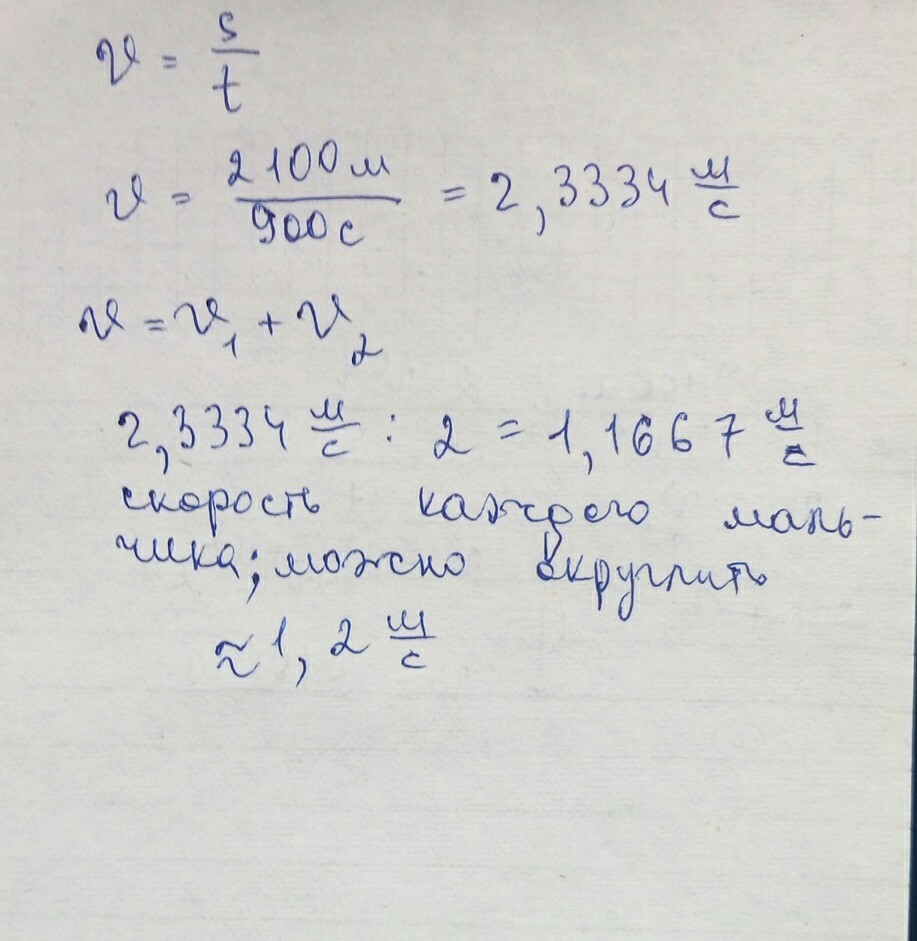 С одного конца улицы вышел мальчик а навстречу ему с той же скоростью через 5 минут с другого конца улицы вышел другой мальчик и встретил первого через 15 минут. Протяженность улицы 2100 м. Какова скорость передвижения мальчиков?