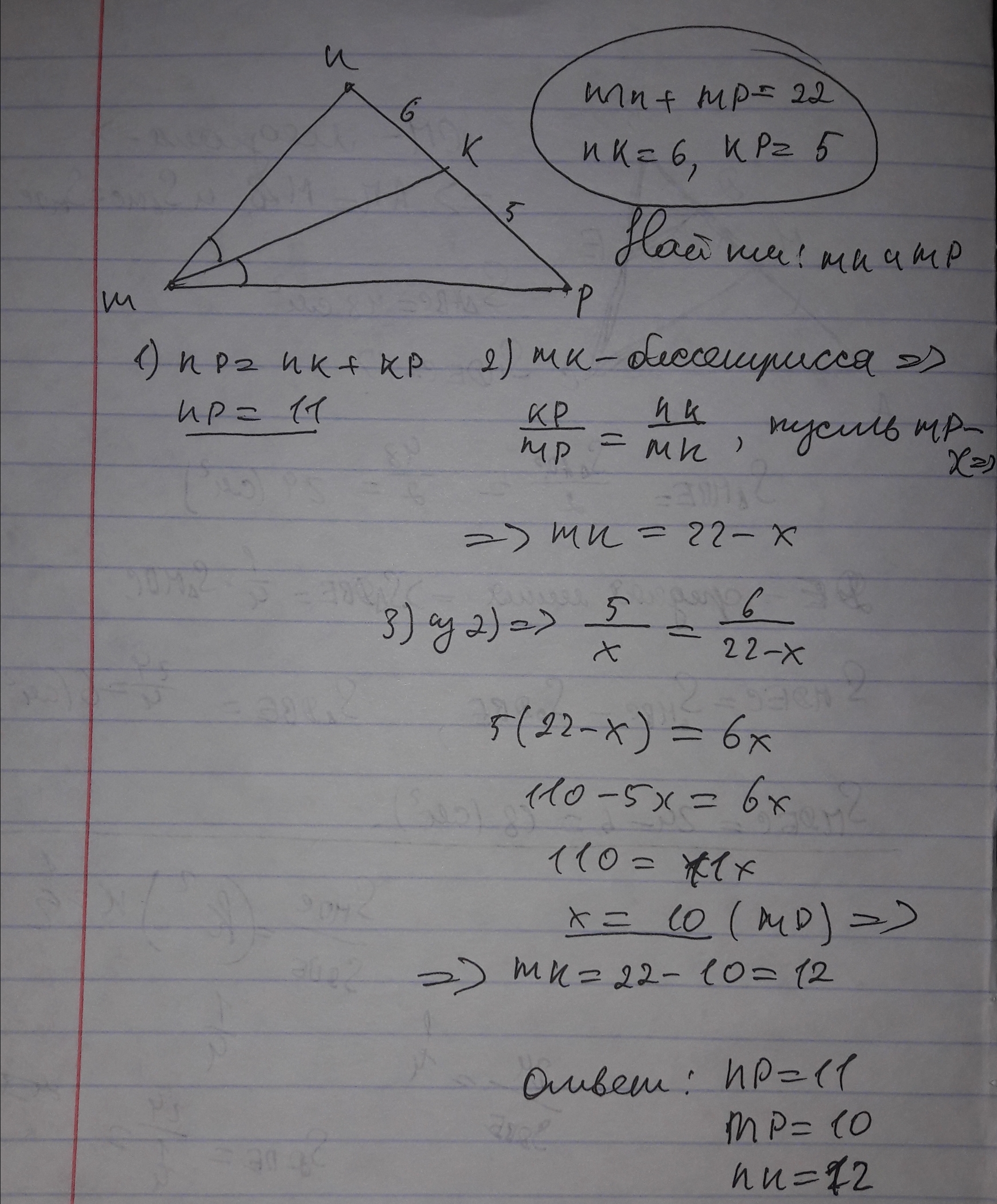 в треугольнике mnp проведена биссектриса mk найти стороны треугольника, если mn+mp=22, nk=6 kp=5