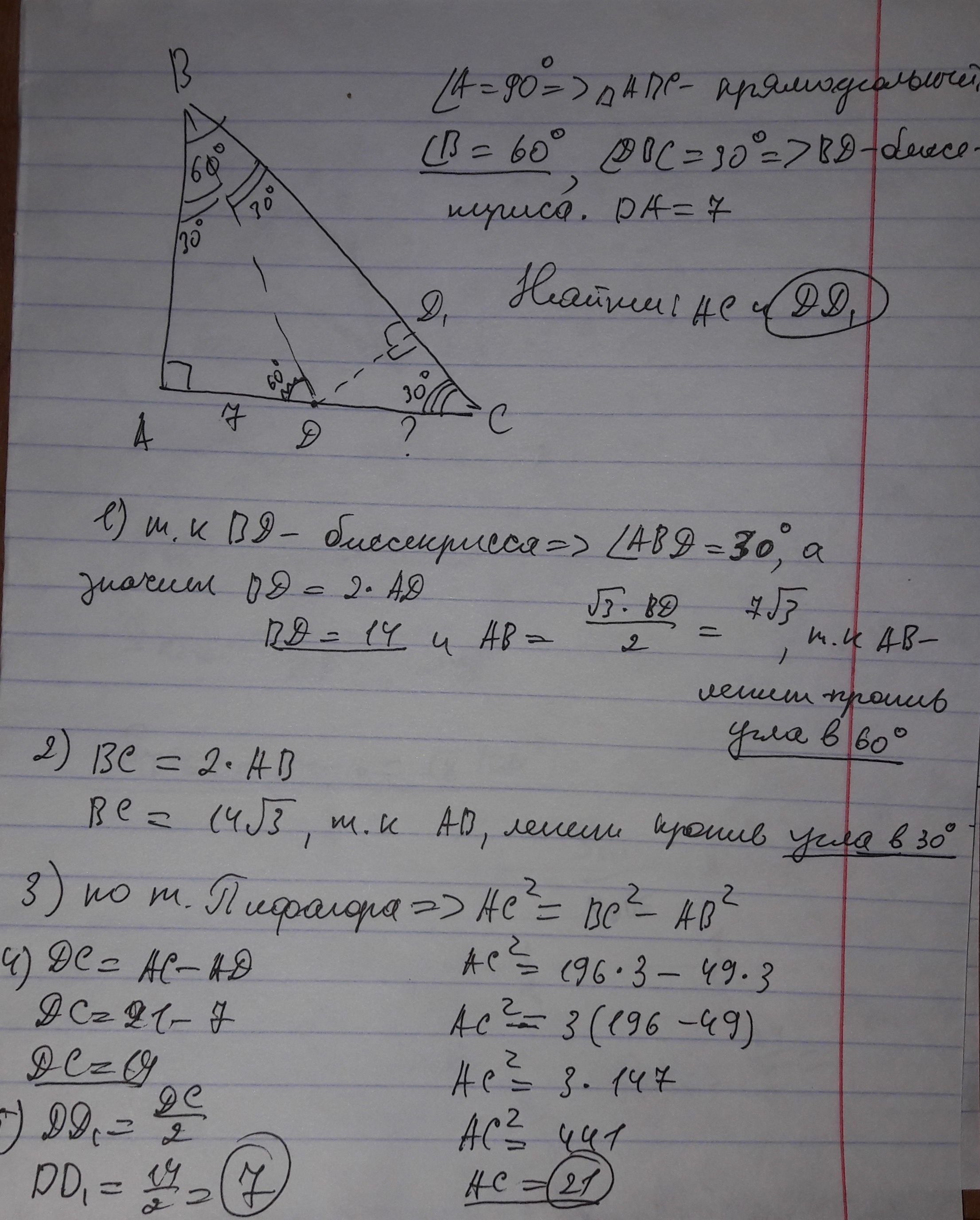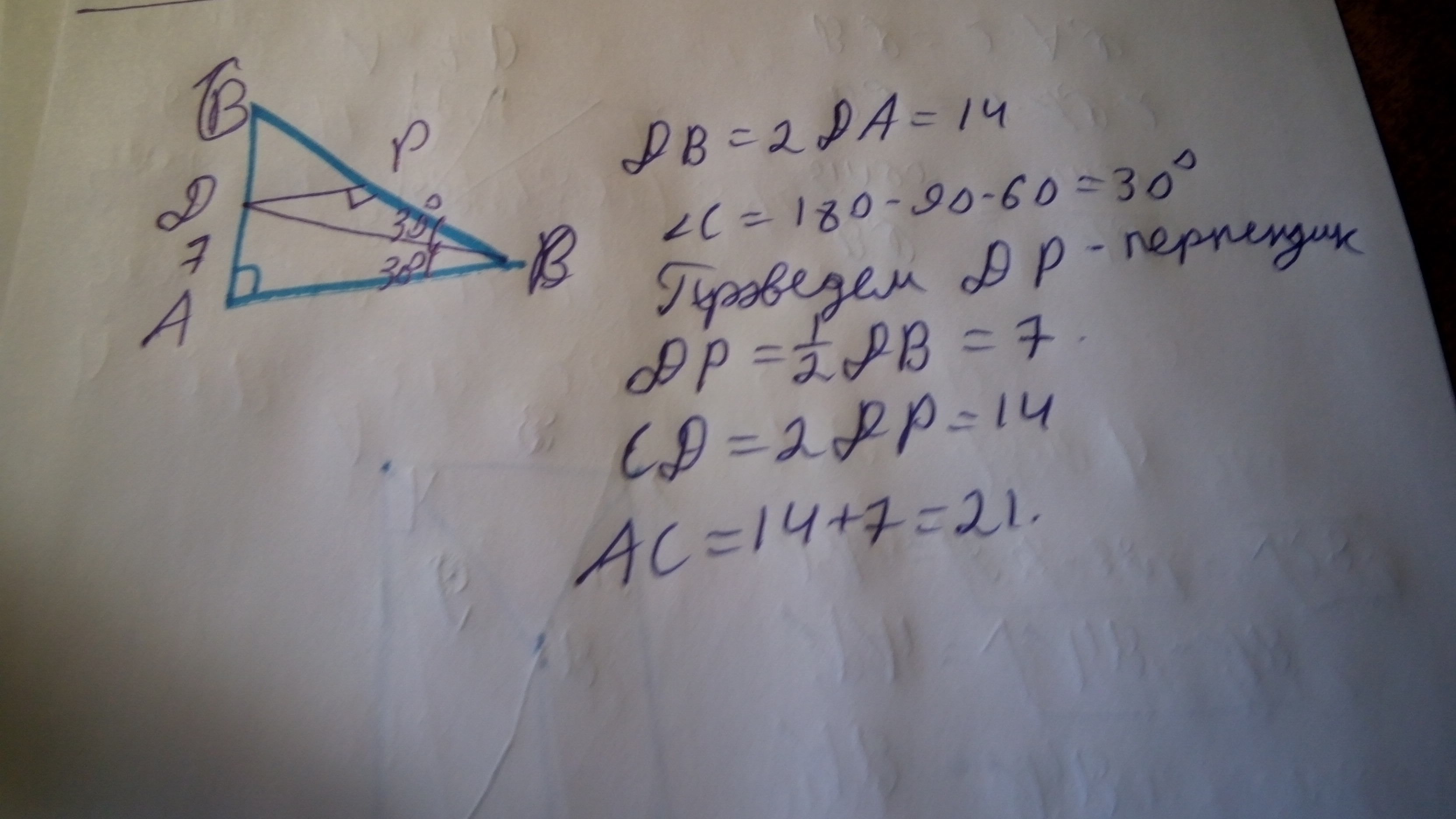 В треугольнике АВС,угол А=90°,угол В=60°. На стороне АС взята такая точка D,что угол DBC=30°,DA=7 см. Найдите длину катета АС и рассотояние от точки D до прямой ВС. ПОМОГИТЕ ПОЖАЛУЙСТА СРОЧНО НУЖНО И ГАПИШИТЕ РЕШЕНИЕ ПОЖАЛУЙСТА