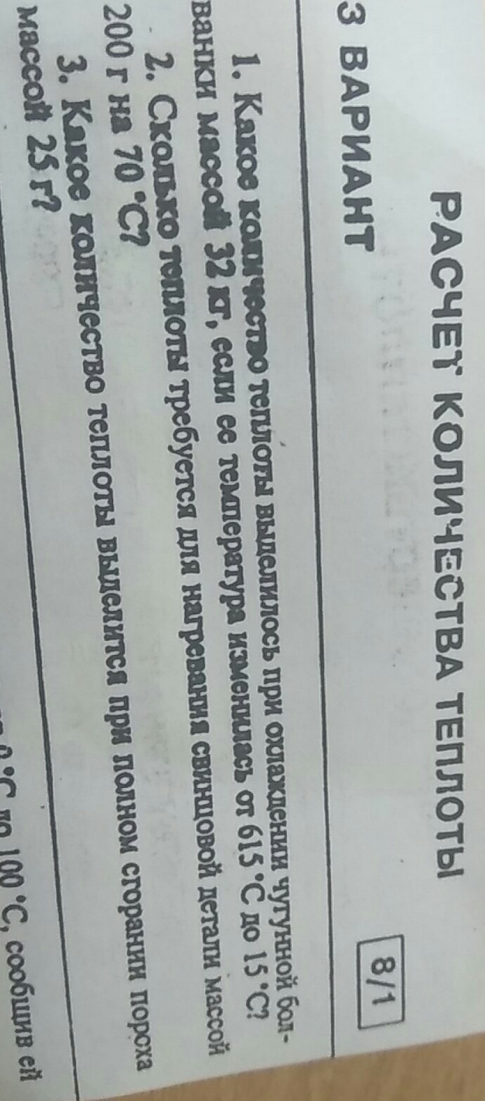Q= cm(t1-t2) , где Q это тепло,которое тебе как раз надо вычислить в 1, 2 и 3 задачах. с это удельная теплоёмкость металла, ты её можешь найти в конце учебника, она должна быть дана. m это масса вещества , в физике СИ это киллограммы, поэтому если тебе даны граммы, центнеры их нужно перевести в киллограммы. А t1 и t2 это температура . T1 это конечная температура , которого достигло тело, а t2 начальная температура тела. К примеру первая задача тебе надо найти тепло, а тепло это Q. Составляешь формулу Q= с ( смотришь в конце учебника сколько это и пишешь) находишь массу вещества и умножаешь на дельту t ( так часто называют разность конечной температуры и начальной)