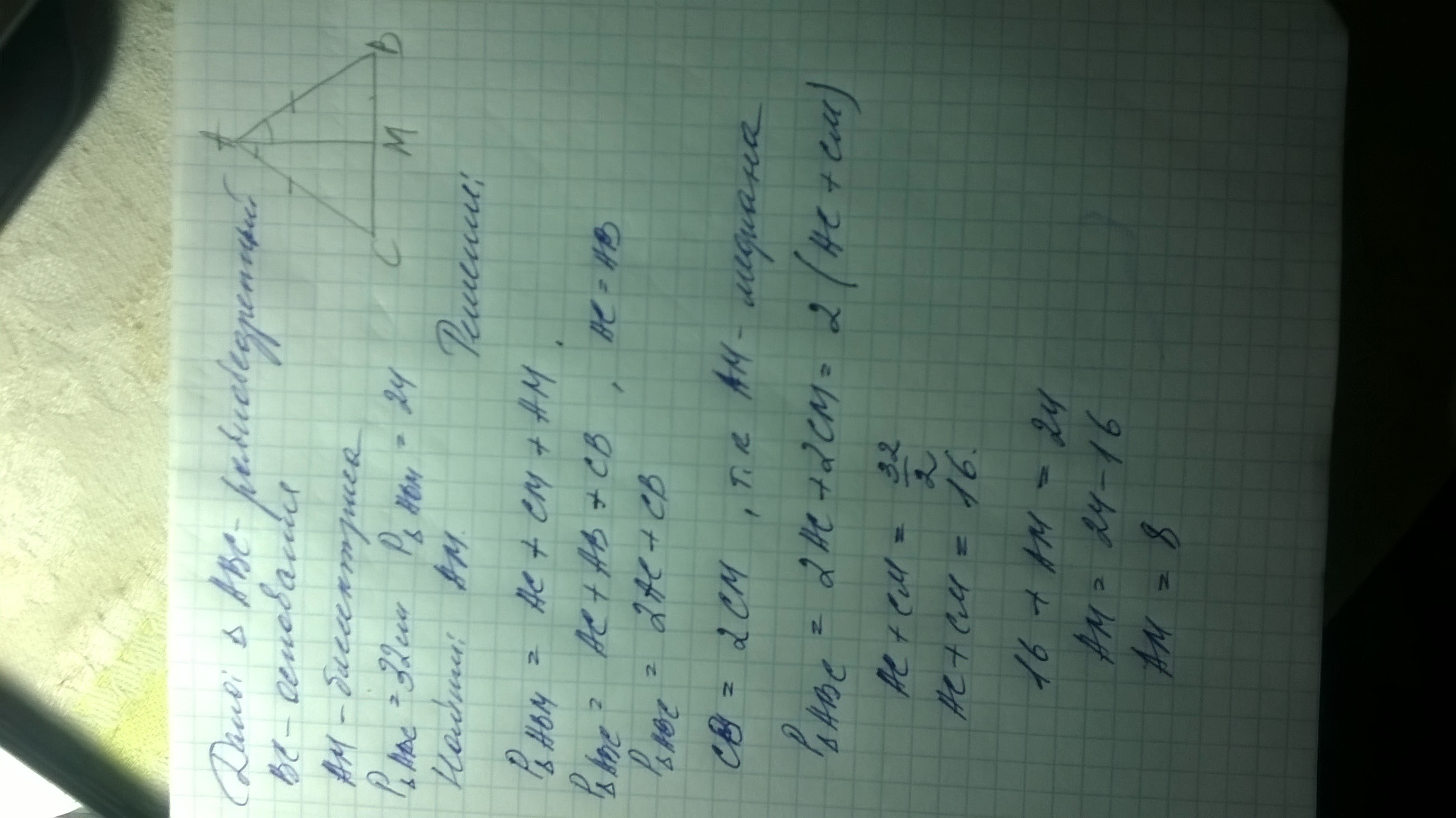 Биссектриса угла А равнобедренного треугольника ABC пересекает основание в точке М. Найдите длину отрезка АМ, если периметры треугольников ABC и ABM равны 32 и 24 соотвественно.