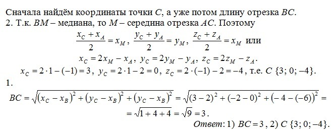 Дан треугольник ABC, BM - медиана. A{-1;2;2} B{2;-2;-6} M{1;1;-1}. Задания: 1. Найдите BC. 2. Найдите C